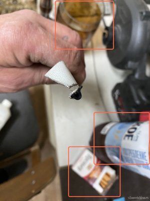 В качестве гидроизолирующего состава я решил использовать полимерно - битумный герметик (Был в запасах). Работал с ним когда-то. И запомнил свойства, среди которых мне очень запомнилось, что он, во-первых, очень прилипчив, Во-вторых, вода его не смачивает. Просто сбегается каплями. Оба эти свойства мне сильно попортили жизнь, когда-то, когда я пытался вымыть руки, вымазанные им. Ни водой, ни моющими не получилось! Оттереть удалось только кварцевым песком, обмакивая в него руки и оттирая после этого песок бумажными полотенцами. Напоследок несколько раз промыл руки бензином. И только потом уже - мылом. А вот сейчас эти свойства меня только обрадовали. Я, вообще-то, полез в свой "сундук", искать силикон, так как хотел использовать его. Но, увидев герметик, и вспомнив эти его свойства, решил, что это будет лучше силикона: