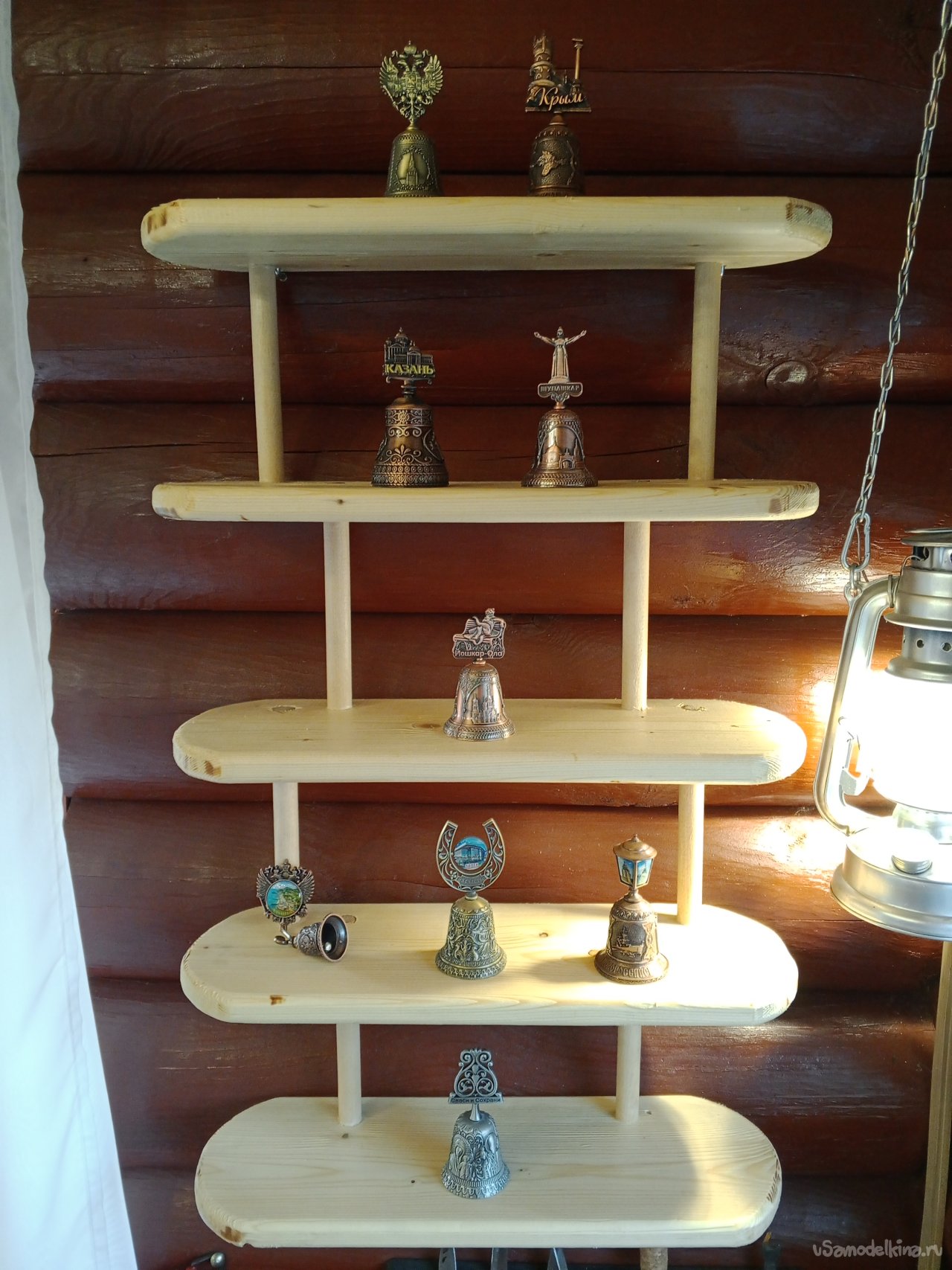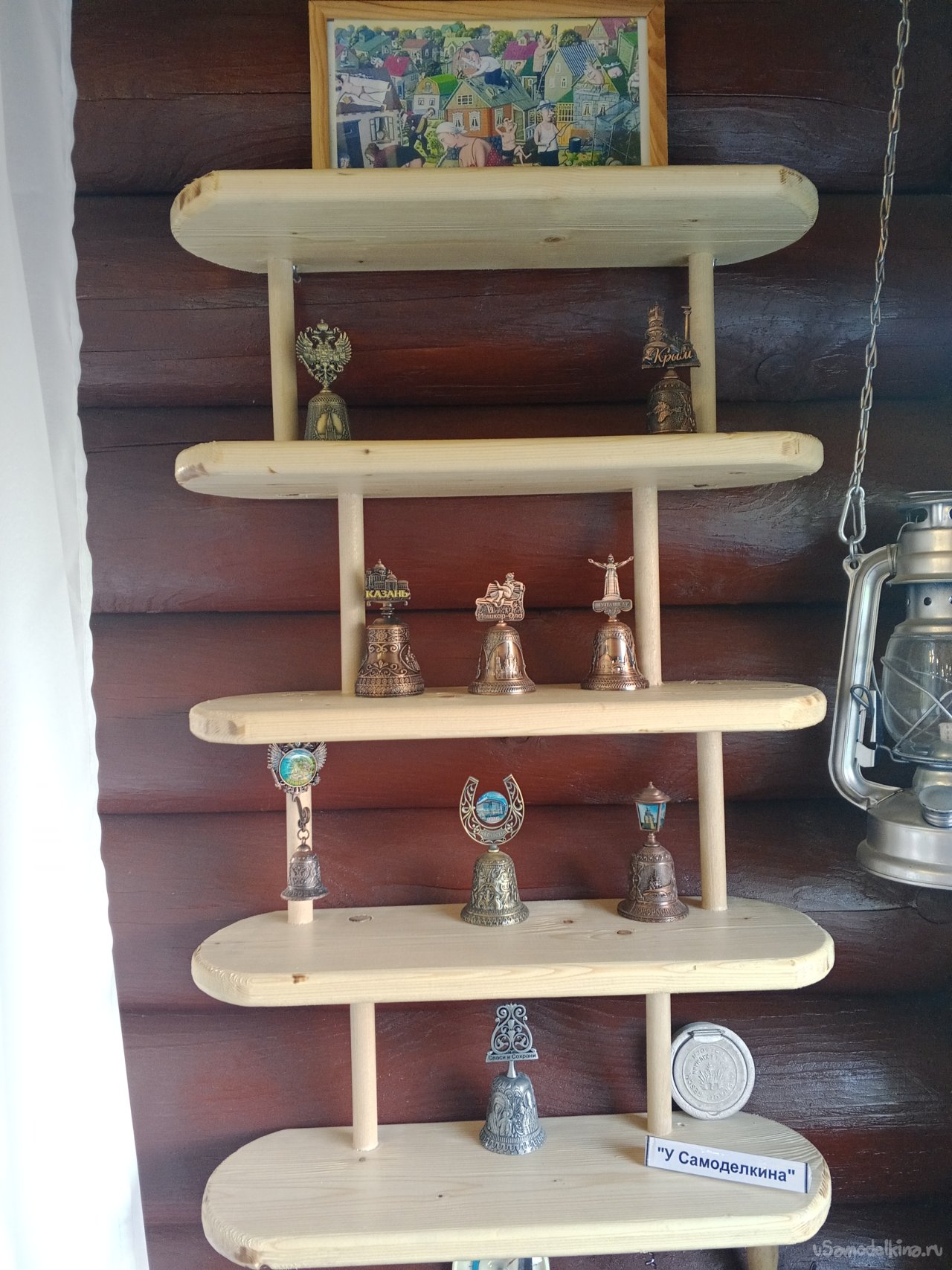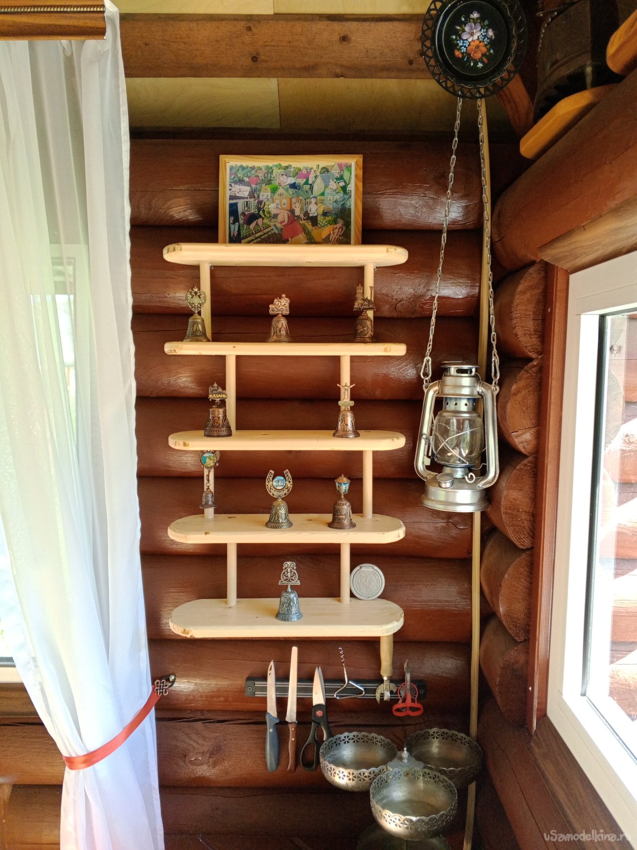 Расставил сувенирные колокольчики и так и сяк, картинку «Садоводы», туда же + мелочевка всякая декоративная разместится. Готово! Много по времени работа не заняла, лак дольше высыхал, да и практически, больших финансовых затрат, кроме покупки «копеечных» костылей, я не понес.