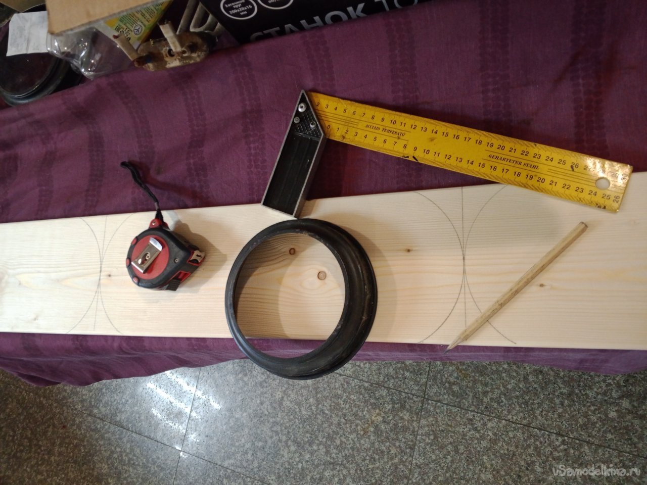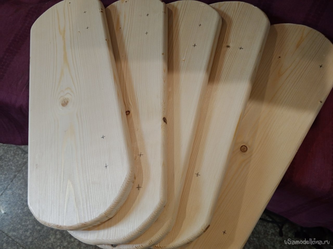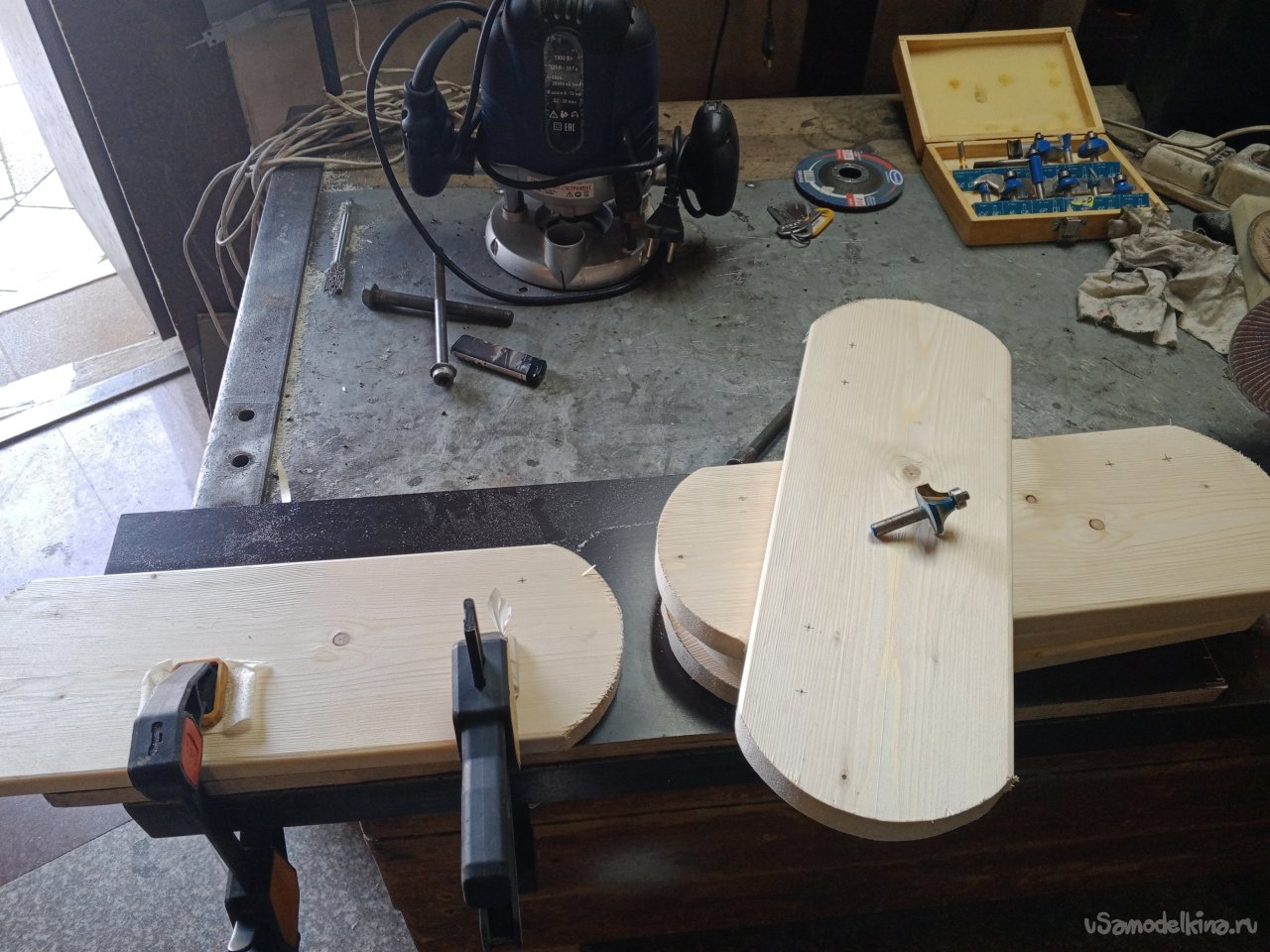 Разметил доску на 5 частей по 400 мм., при помощи «подвернувшегося мне под руку» кольца, сразу же вычертил округлые торцы. Электролобзиком выпилил заготовки и при помощи фрезера «обкатал» края и торцы.