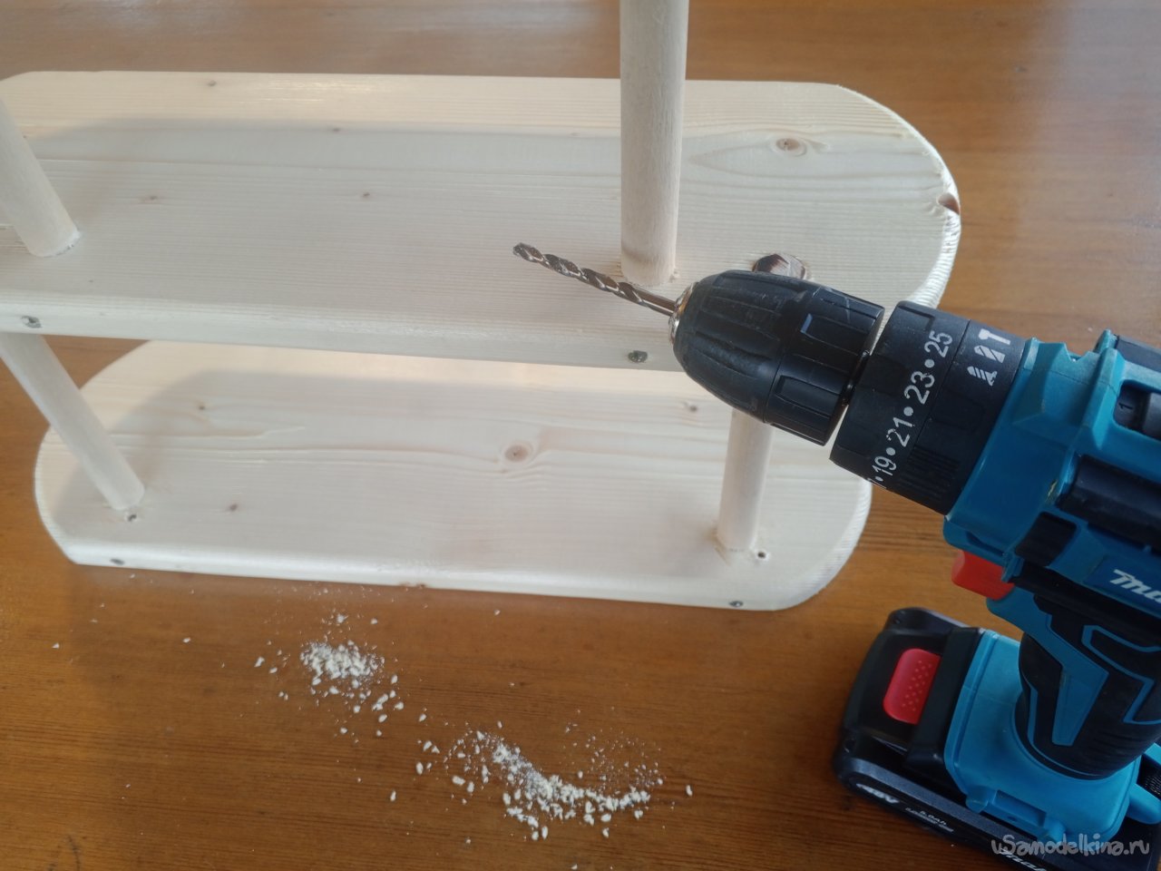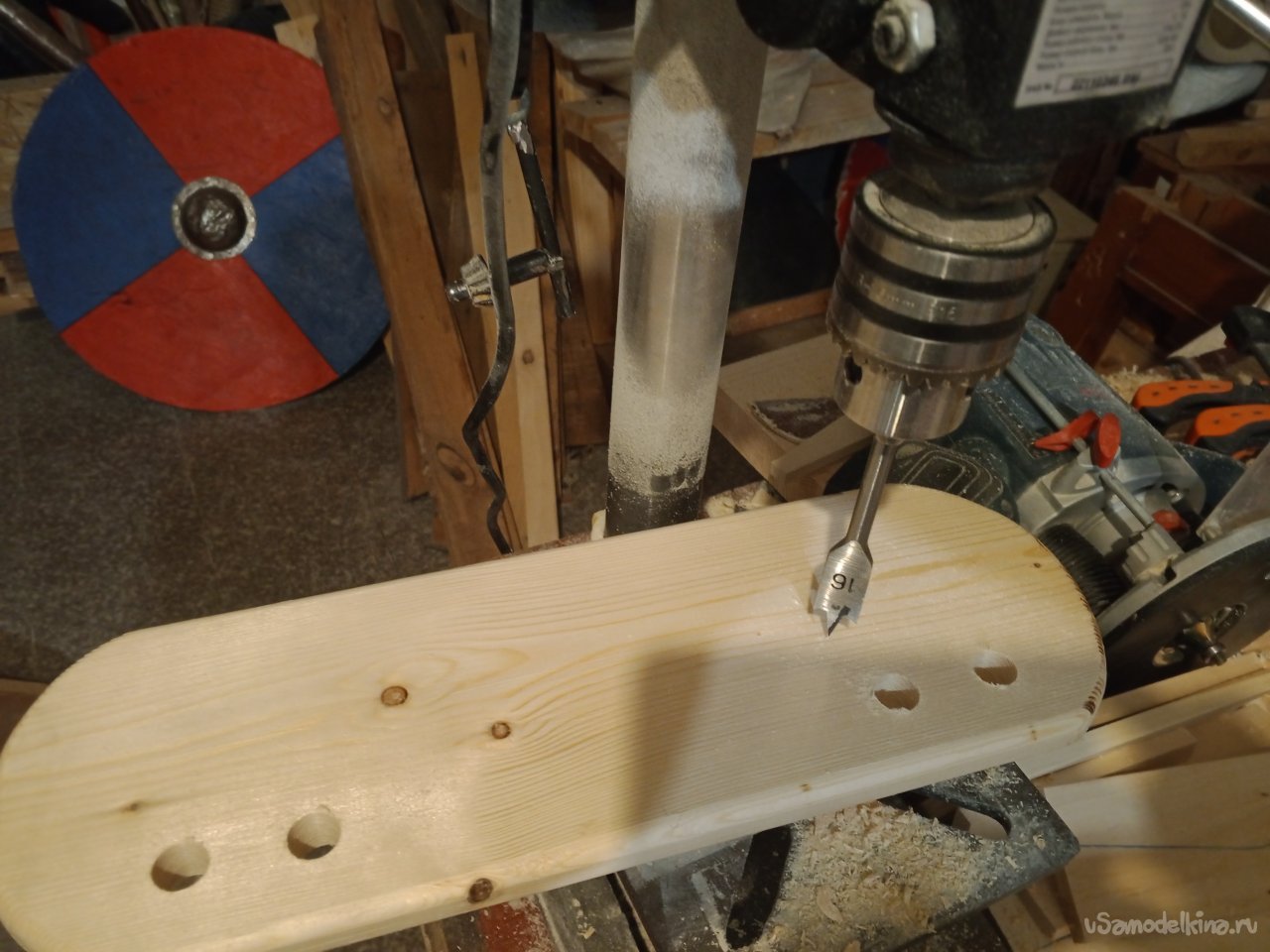 На вертикально – сверлильном станке, «пером» на 16, просверлил в заготовках отверстия. Разметку отверстий делал так, чтобы вставляемые шканты (стойки) находились в разбежку, и каждая была бы в своем посадочном месте, для прочности конструкции. Стыковать стойки внутри доски не стал – узкая, 18 мм. по факту, а сплошняком пропускать, длинны шканта не хватило бы.