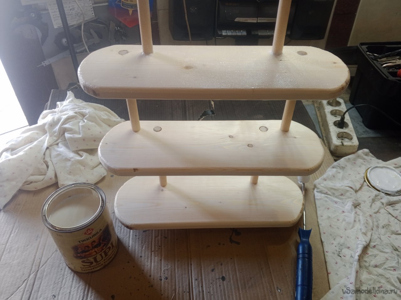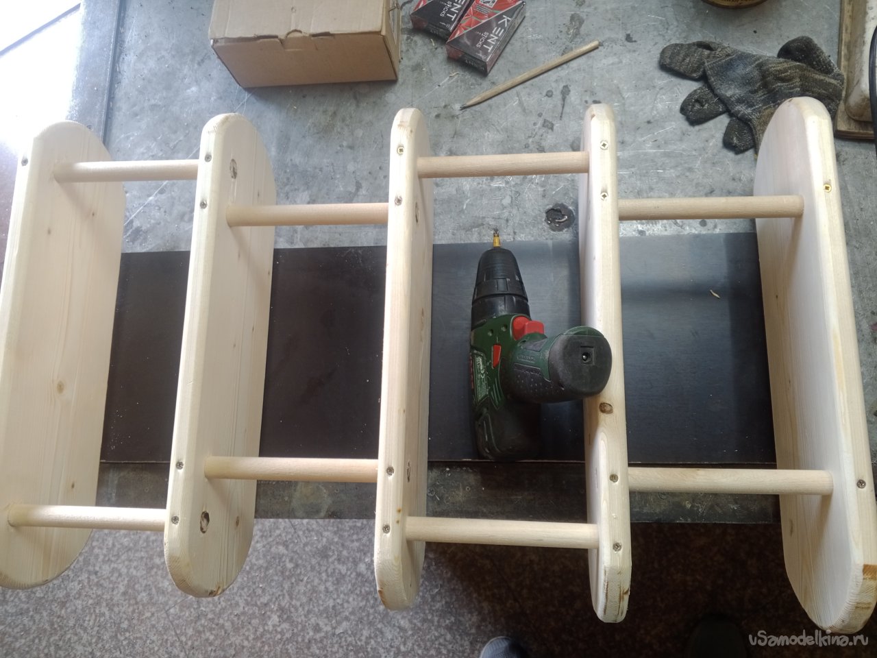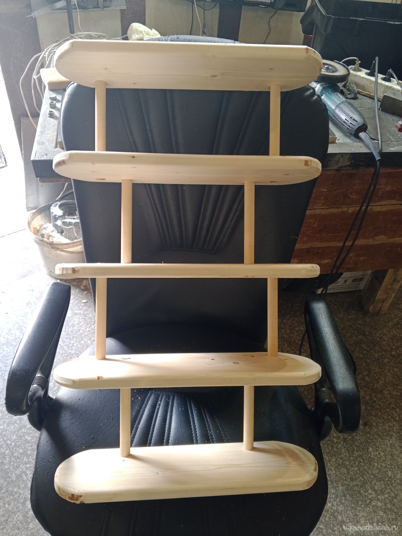 Напилил шканты по 170 мм., чтобы в итоге, между ярусами получилось по 150 мм., снял фаски на торцах и собрал все заготовки воедино. В задней части, где имеются соединения стойки с ярусом, протянул их саморезами. Вот такая консольная конструкция получилась.