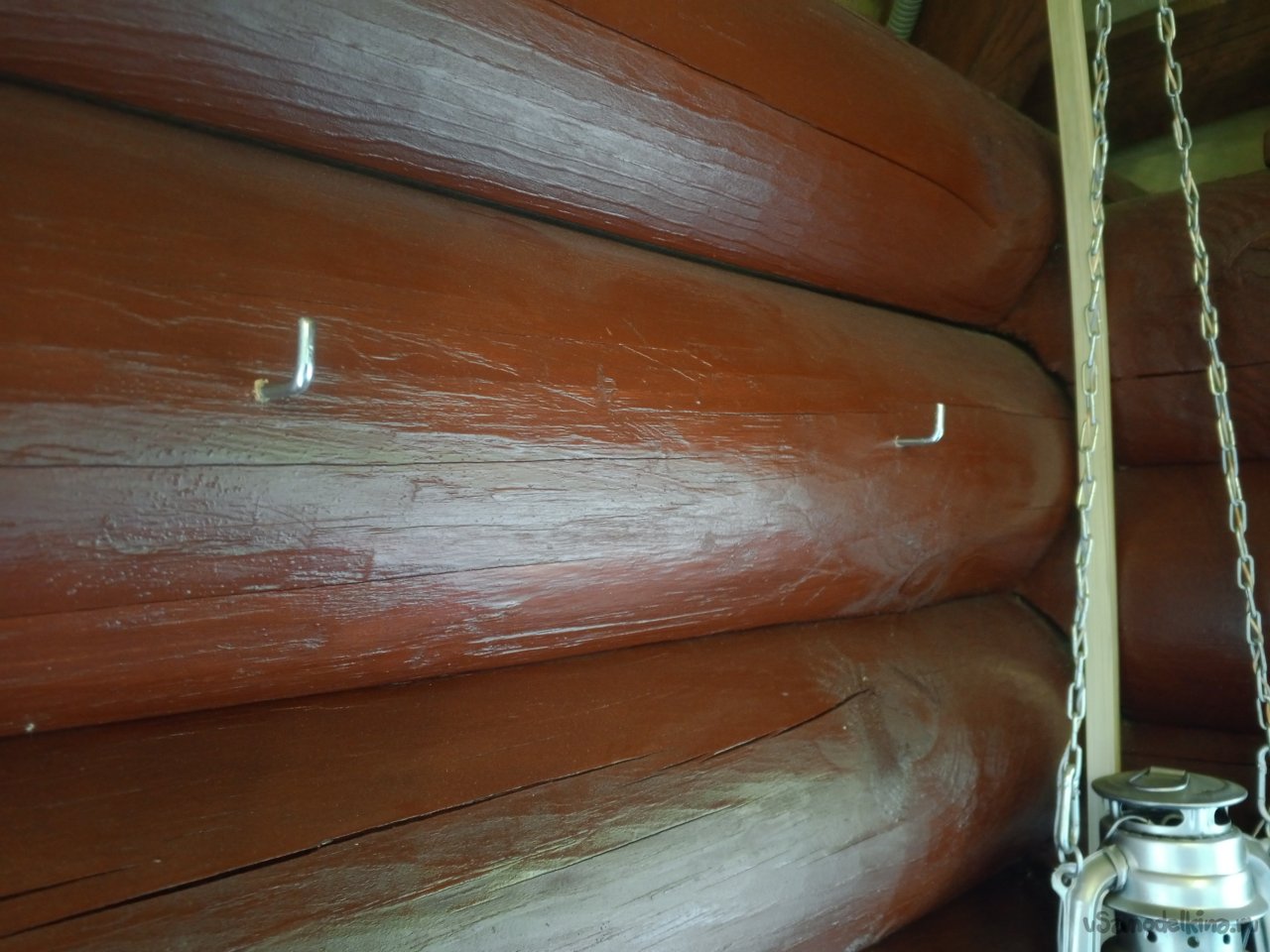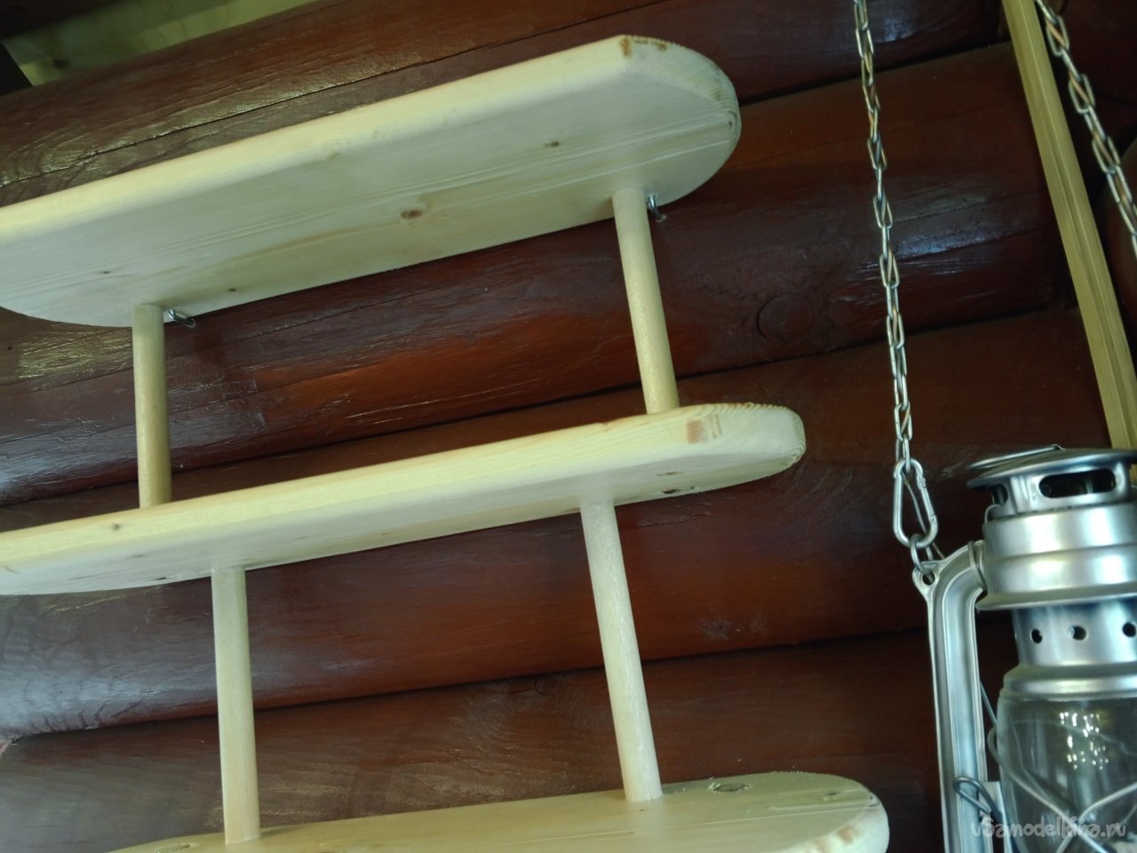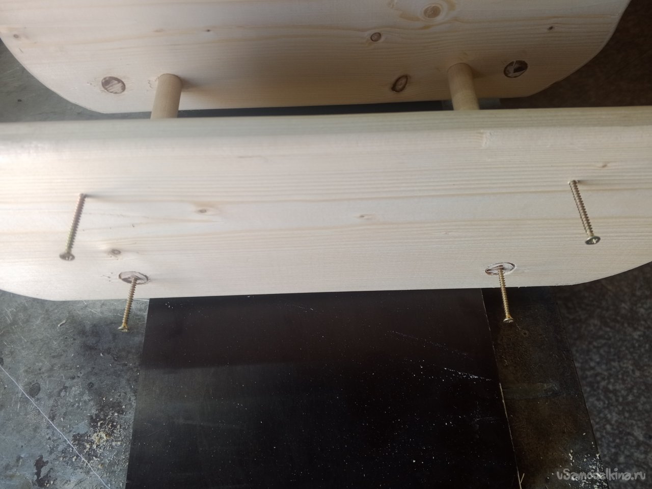 Для удобства, закрутил временные саморезы «ножки», чтобы покрытая лаком поверхность не касалась стола, да и переворачивать за них полку удобнее, не касаясь деталей. Нашлась у меня «заначка», в виде банки лака, для саун и бань, им я и покрыл всю конструкцию, на несколько слоев за раз. После высыхания лака, выкрутил саморезы, места их входа в доску и стойку «припудрил», да и видны эти точки все равно не будут.