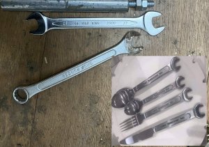 И вкрутил получившуюся шпильку, используя в качестве шляпки болта две гайки М10, которые я "законтрил". Ввернул до упора. Пока забитый участок не вошёл в резьбу и сильно затянул. В итоге, и на этих двух ножках у меня появилась наружная резьба М10.