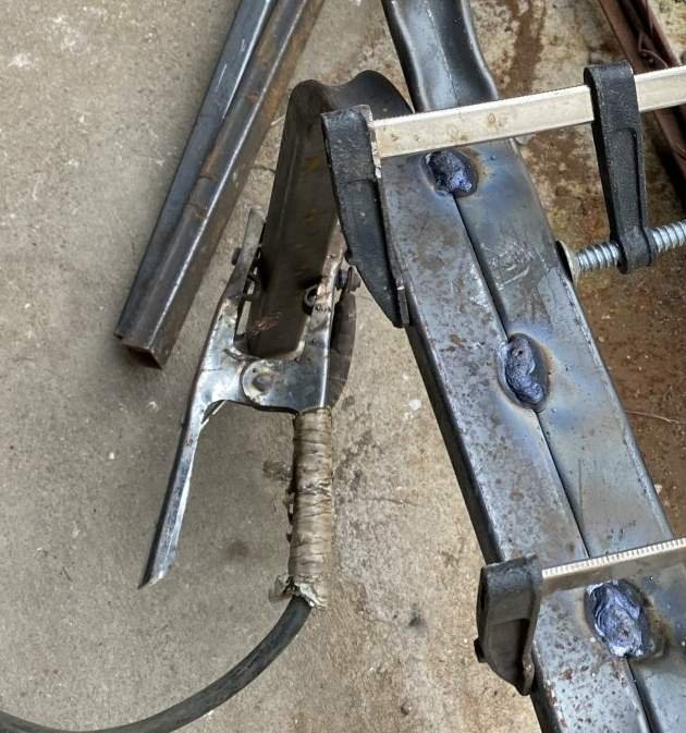Для жёсткости вырезал из такой-же трубы поперечины и вварил их на половине высоты ножек: