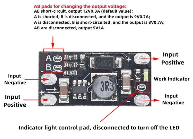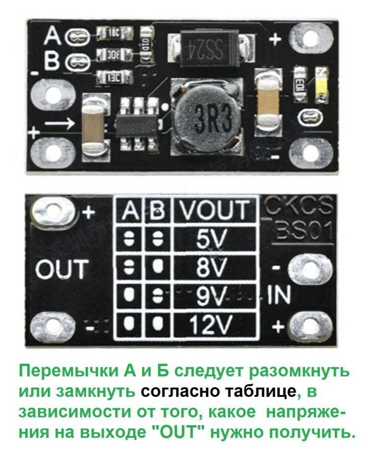 Разработчики мини-платы предупреждают, что на выходе платы при включении питания наличествует первоначальный прыжок напряжения. Поэтому на момент подачи на мини-плату входного напряжения (+2,5 … +4,9 Вольта), к выходу платы уже должна быть подключена нагрузка.