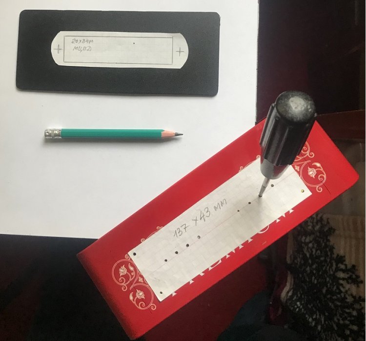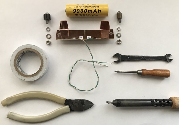 Сборка держателя аккумулятора 18650 заключается в прикручивании стеклотекстолитного (90 х 20 х 2,5 мм) основания к дну корпуса МЦИРА с помощью двух винтов М4 с полукруглыми головками.