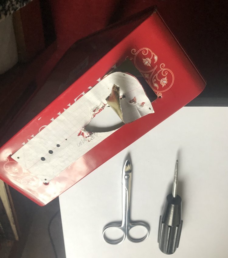 Фото не для слабонервных. Плавный выход ножниц из центрального отверстия, проделанного шилом, на вырезание по периметру.