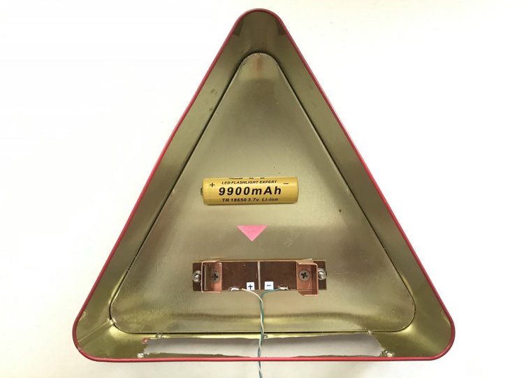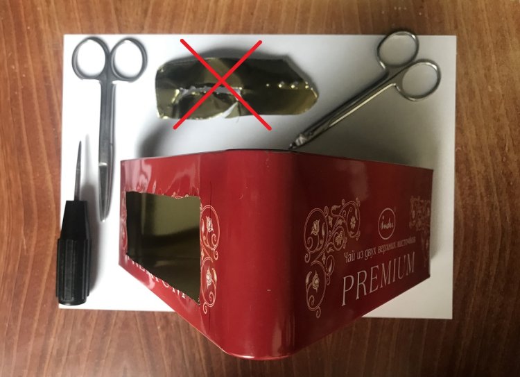 Отличительная особенность музыкального центра с индикатором разряда аккумулятора (далее просто МЦИРА) в том, что для его корпуса использована красиво оформленная коробка от чая премиум класса. Коробка имеет треугольную форму и очень неприятное для обработки тонкое жестяное «тело». Сверлить и особенно обрабатывать напильниками такой корпус не представляется практически возможным. Отверстия получаются с длинными вытянутыми заусеницами, а обработка напильником приводит к сминанию корпуса. Поэтому было принято решение установить все органы управления на пластиковой (легко обрабатываемой) панели. Панель крепится к корпусу с помощью 6 винтов. А ниша в тонком жестяном корпусе под пластмассовую панель вырезается ножницами с укороченными полузакруглёнными режущими концами. Вырезание ниши делается в следующем порядке.