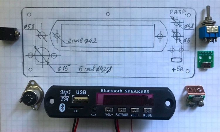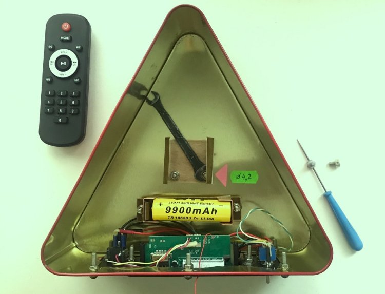 Что нового в статье? 1). В качестве корпуса использована очень красивая рельефная коробка. Однако коробка сделана из тонкой (не удобной для сверления отверстий) жести. Найден выход из создавшейся ситуации. 2). Вместо платы защиты 4056, обслуживающей зарядно-разрядный режим литий-ионного аккумулятора TR 18650, применён индикатор разряда аккумулятора на специализированной ИМС (КР1171СП28). 3). «Два в одном»: повышение долговечности и защита выхода стерео УМЗЧ от КЗ!!! 4). Быстрый (5-секундный) доступ к аккумулятору. 5). Удобное расположение дополнительных комплектующих (ИК-ПДУ, кабеля для подключения внешних АС, ЗУ для литий-ионного аккумулятора 18650 от USB – разъёма) внутри вместительного корпуса.