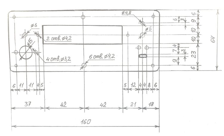 Чертёж пластиковой передней панели МЦИРА. Отверстие под язычок зуммера пропущено, так как зуммер даже спрятанный внутрь корпуса звучит громогласно.