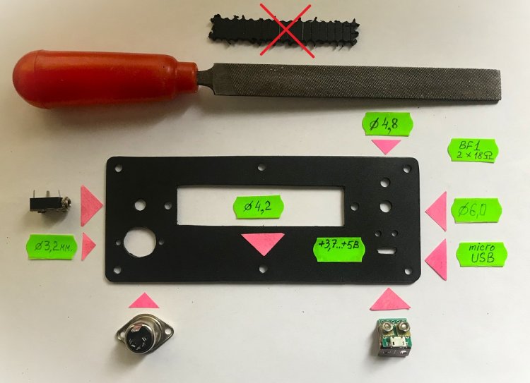 Прямоугольный паз в передней панели, проделан предварительным сверлением и выровнен плоским личным напильником. Передняя панель при обработке зажималась через 2 слоя электрокартона в губки слесарных тисков.