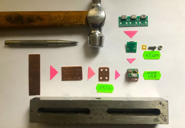 Для изготовления уголка – держателя micro USB гнезда использован кусочек листовой красной меди толщиной 1 мм.