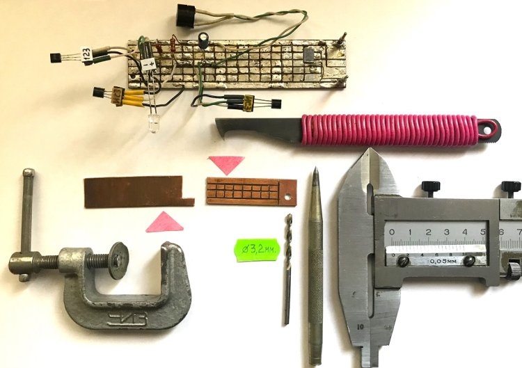 Первоначально – проверка ИРА на самодельной макетной плате. Макетка изготавливается из односторонне фольгированного материала. Для аккуратного разрезания медной фольги резаком на клеточки, используется линейка с ограничителем (на линейку указывает левая красная стрелка-треугольник). Без ограничителя трудно будет с двух сторон макетной платы (сверху и снизу) оставить неповреждённые резаком горизонтальные шины общего провода и питания.
