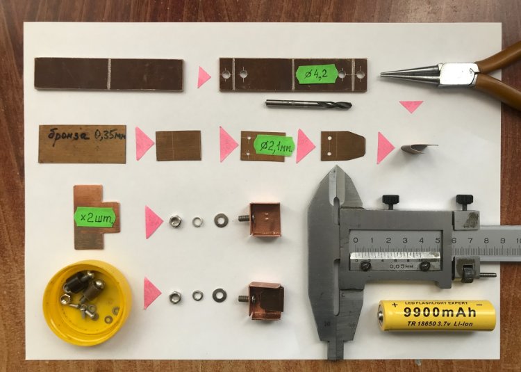 Изготовление держателя аккумулятора 18650. Основание – фольгированный стеклотекстолит 90 х 20 х 2,5 мм. Пружина для медной контактной стойки «+» изготовлена из пружинящей бронзы толщиной 0,35 мм. Изгиб пружины (для исключения разлома пружины) производится после её расклёпывания на медной контактной стойке «+» через круглогубцы. (см. рисунок 16).