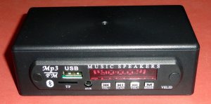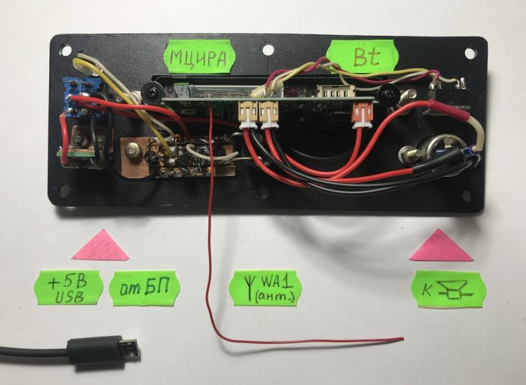 Этикетка «Работа с FM-приёмником» прикреплена прозрачным скотчем, имеющим ширину 50 мм. Стерео УМЗЧ работает на внешние динамики подключаемые к МЦИРА кабелем через 5-контактное гнездо XS1 типа ОНЦ-ВГ-4-5/16).