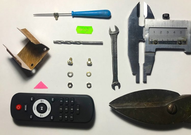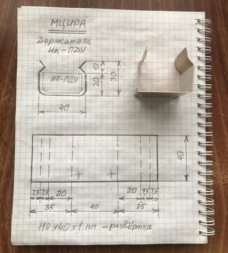 Держатель ИК-ПДУ изготовлен из пружинящей бронзы толщиной 1 мм. Диаметр двух отверстий в держателе равен 4,2 мм (под винты или болты М4).