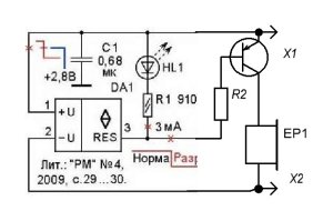- цепи, состоящей из красного мигающего светодиода HL1, токоограничительного резистора R1 и сигнализирующей о разряде аккумулятора GB1;