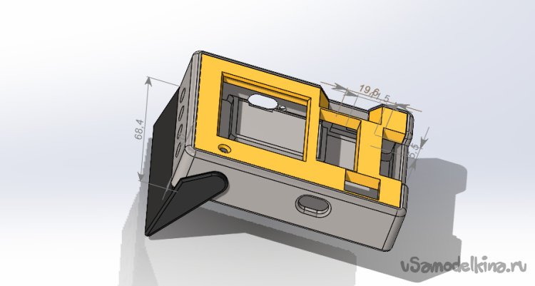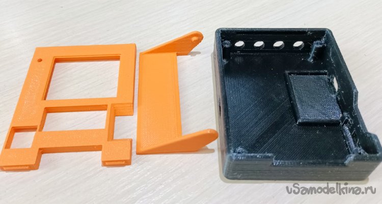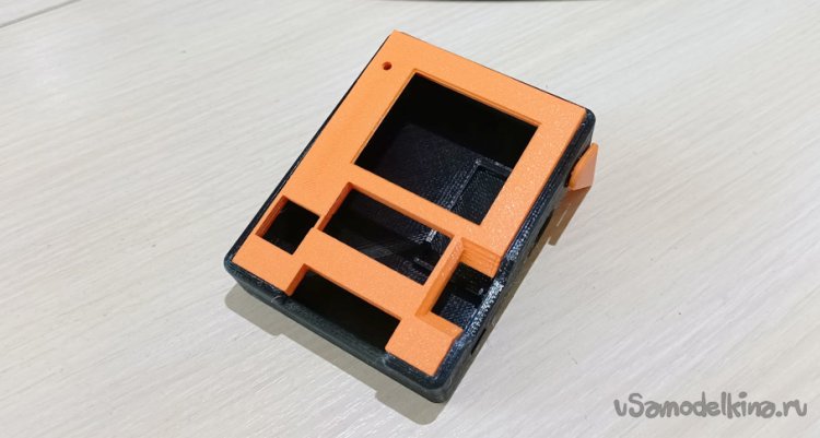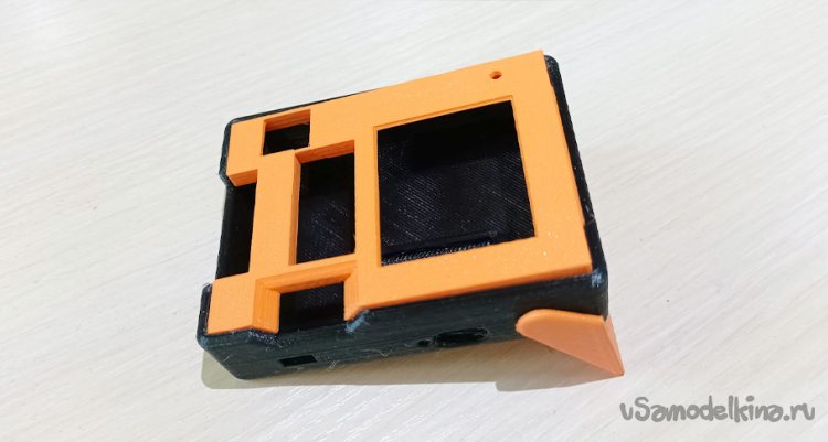 Верхняя панель печатается «лицом» на стол. Корпус - дном на столе. Упор - как на фото ниже. Верхнюю панель можно печатать любым пластиком (ABS, PLA, PETG), а вот корпус желательно нехрупким, достаточно эластичным, чтобы при защелкивании стенки немного были подвижные (например, PETG).