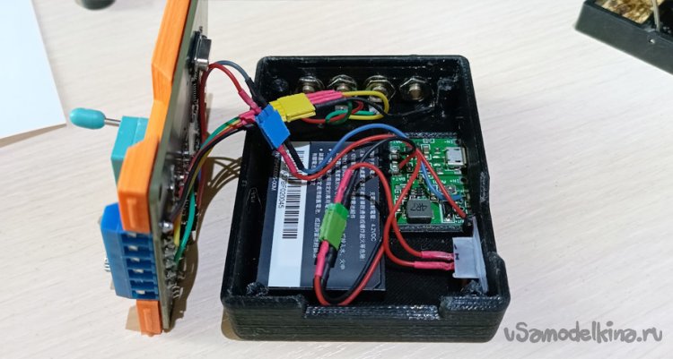 Соединить разъемы тестера, платы, гнезд и аккумулятора. Проверить работоспособность тестера. Проверить режим зарядки, подключив источник 5В к разъему зарядной платы. Красный диод на плате говорит, что зарядка идет. Если горит зеленый светодиод, то зарядка завершена.
