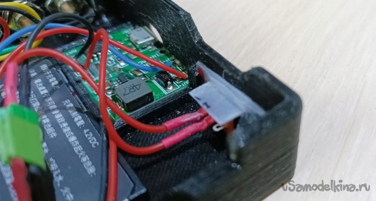 Подключаем зарядную плату к источнику питания 5В, подстроечным резистором на плате и с использованием вольтметра устанавливаем выходное напряжение 9В. Припаиваем провода от зарядного модуля к аккумуляторной батарее через выключатель, который устанавливается сбоку корпуса. Выключатель подключается так, чтобы он разрывал плюсовой контакт аккумулятора и зарядной платы. Таким образом при длительном хранении для уменьшения разряда батареи можно будет отключать аккумулятор.