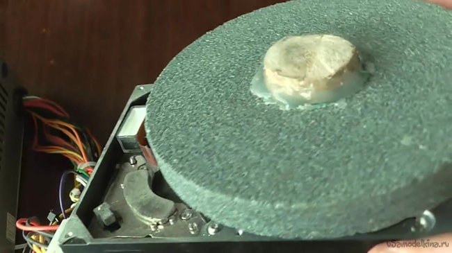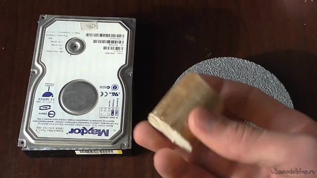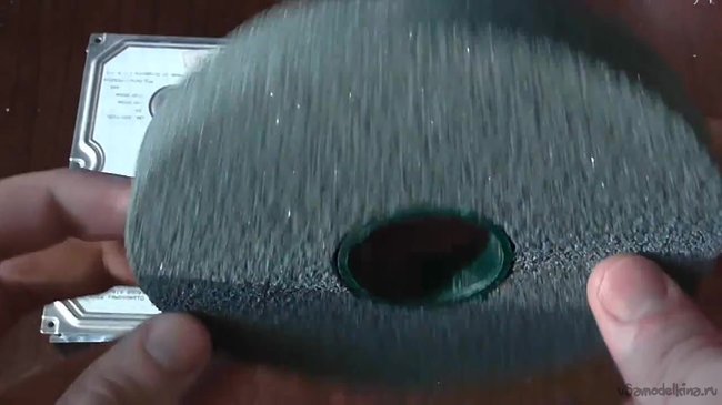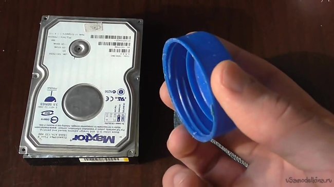 Далее берем нашу крышечку и проделываем отверстие так, чтобы оно крепилось на средней части жесткого диска. Нужно это потому что, шлифовальный круг не достигает до средней части. Альтернативным способом может стать распиливание боковых частей жесткого диска для того, чтобы освободить доступ, однако этот процесс очень трудоемок.