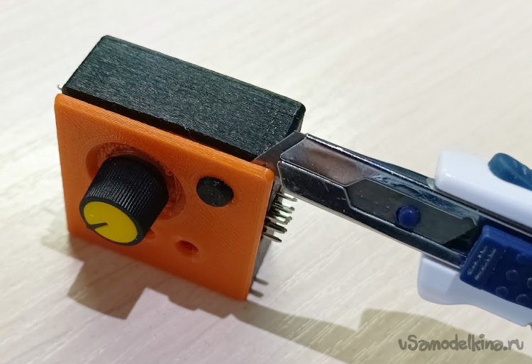 Чтобы вскрыть корпус после защелкивания, необходимо лезвием канцелярского ножа аккуратно со стороны кнопки поддеть крышку в районе защелки и, отклоняя наружу стенку корпуса, вытолкнуть защелку из паза.