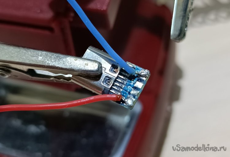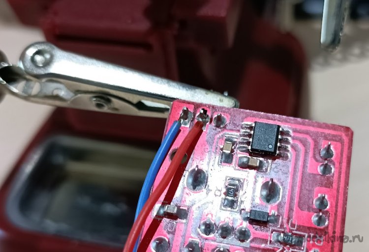 Для подключения разъема к плате необходимо подготовить 2 провода (желательно разных цветов) требуемой длины и припаять к разъему и плате тестера. Провода к разъему припаивать так, чтобы они не мешали установке его в корпус.