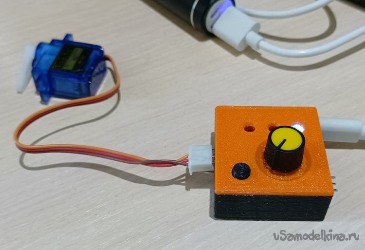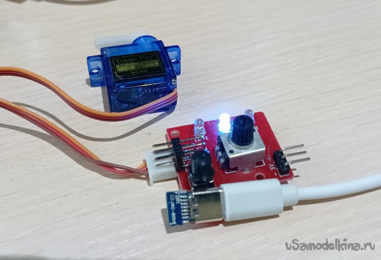 Если все подключено правильно и есть питание на разъеме, то тестер включится (на пару секунд загорятся все 3 диода). Далее работа будет регулироваться нажатием кнопки: при очередном нажатии режим работы тестера будет переключаться на следующий (левый диод – ручной режим: вращение подключенного сервопривода синхронно с вращением резистора; центральный диод – нейтраль: сервопривод установится в «нулевое» положение; правый диод – авто: сервопривод будет совершать повторяющиеся движения).