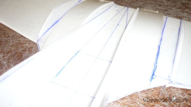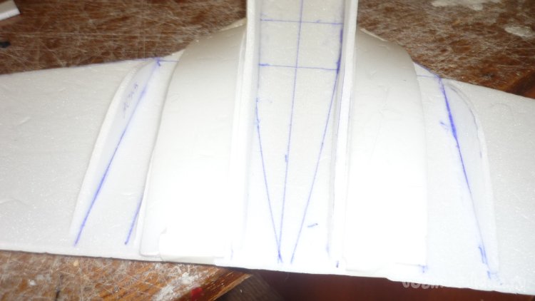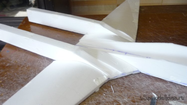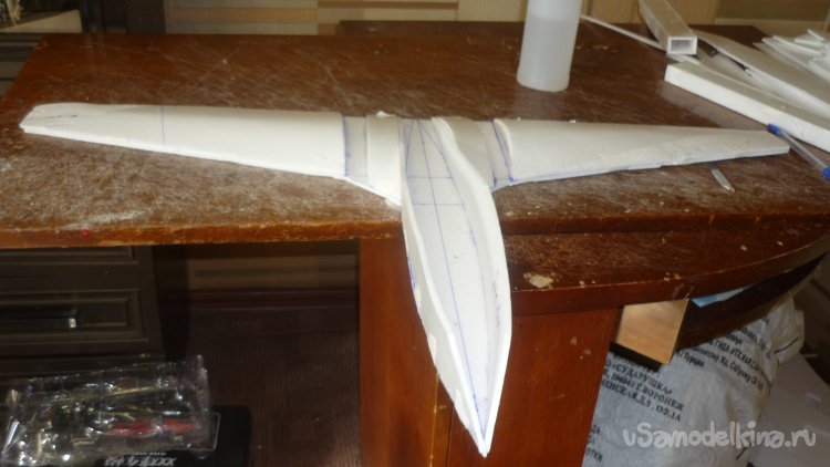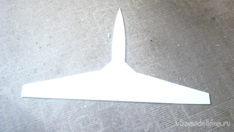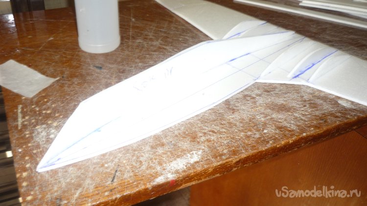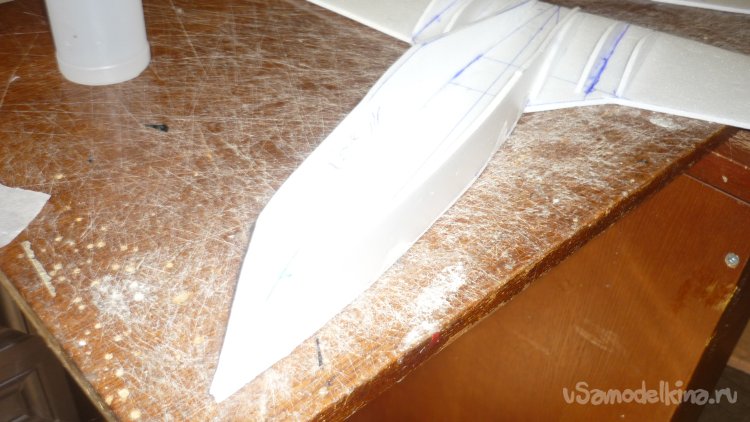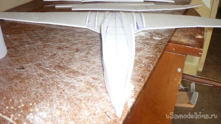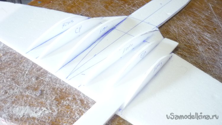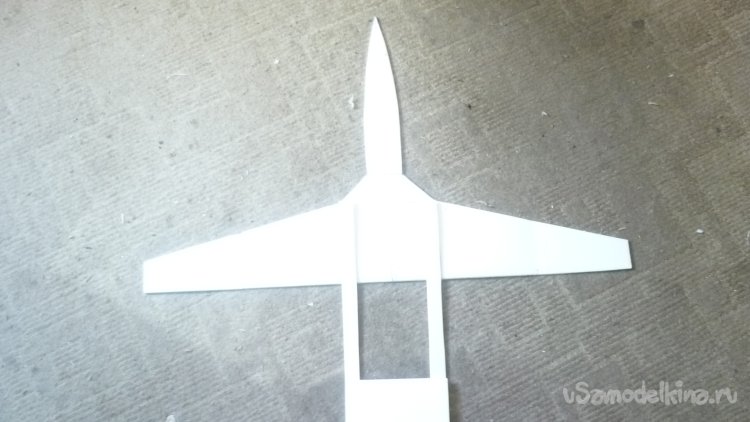 Вначале вырезал заготовку нижней обшивки крыльев и носовой части фюзеляжа.