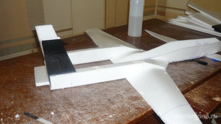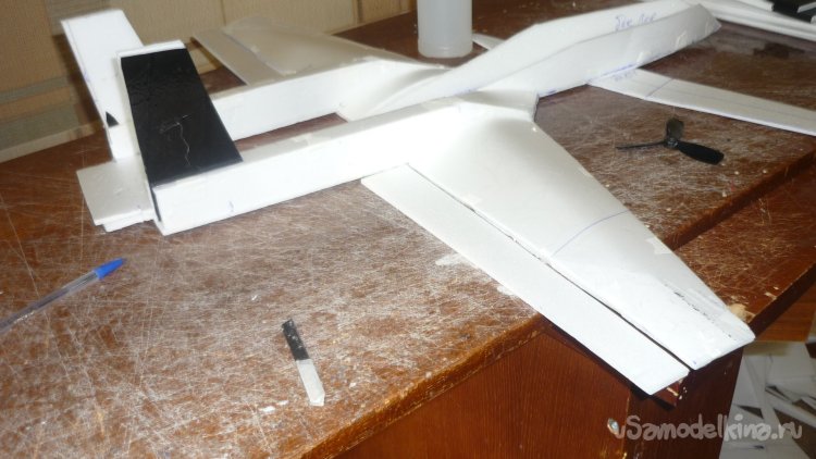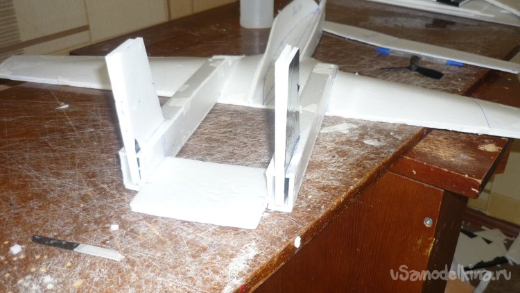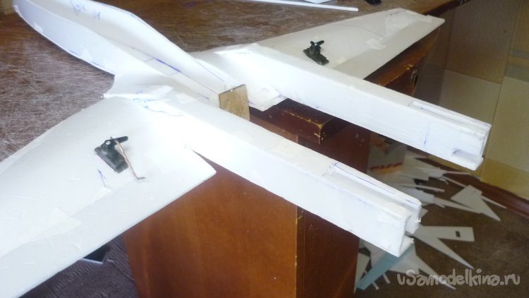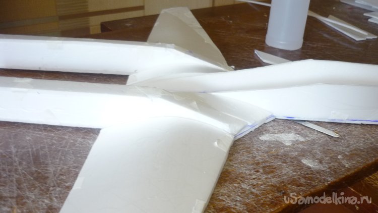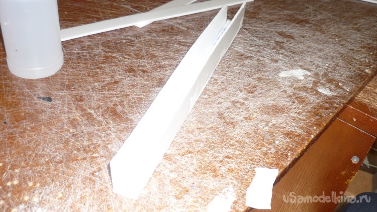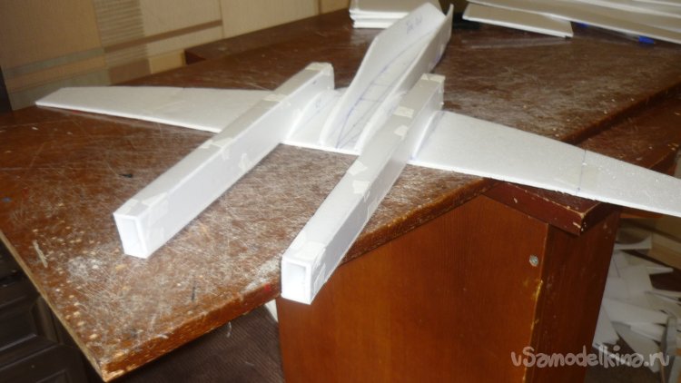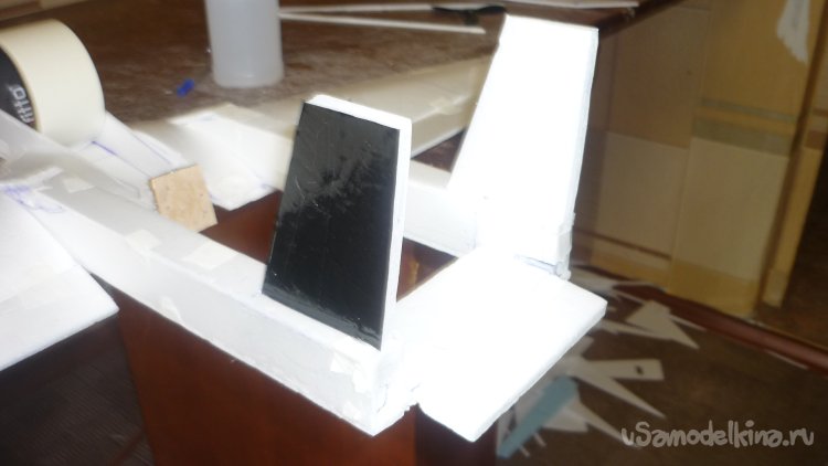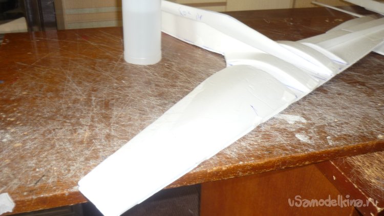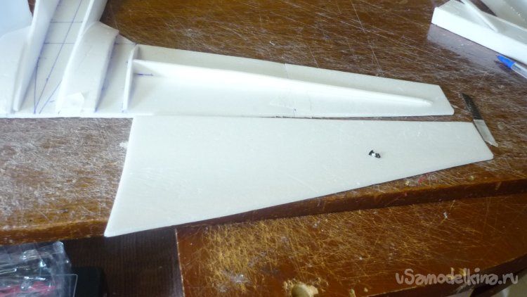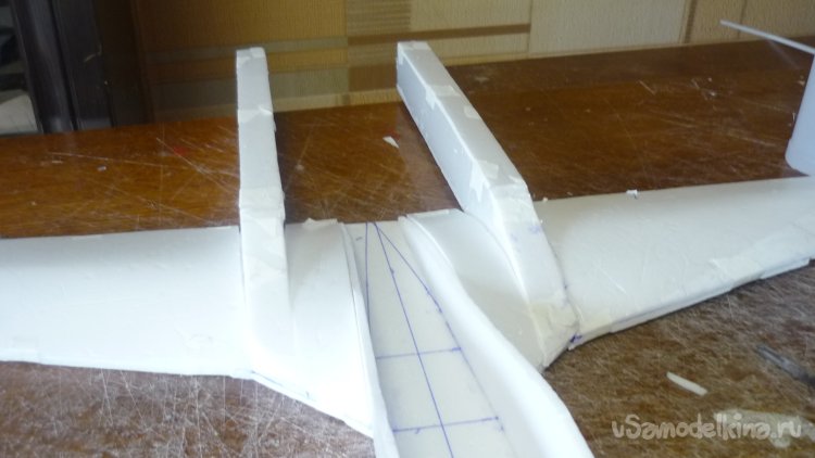 От заготовки стабилизатора отрезаю руль высоты. и навешиваю его на бумажный, малярный скотч. Монтирую готовый стабилизатор на хвостовые балки.
