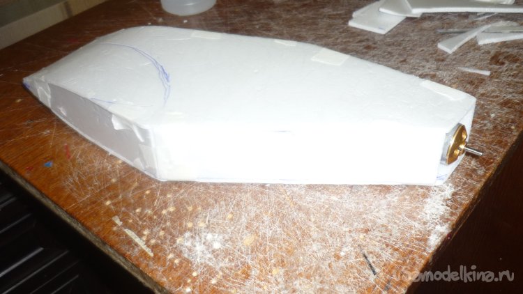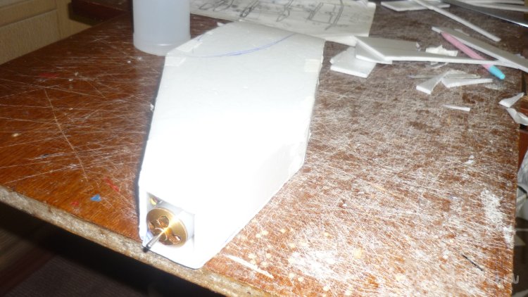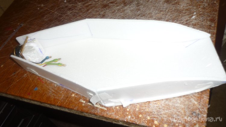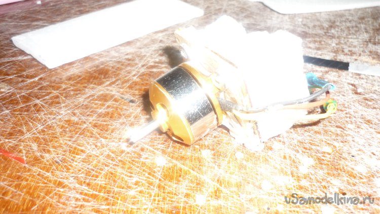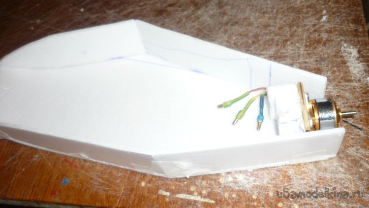 Вырезал кусочек утеплителя, приклеил кусочек 3 мм. фанеры, получилась моторама. Смонтировал на неё мотор.