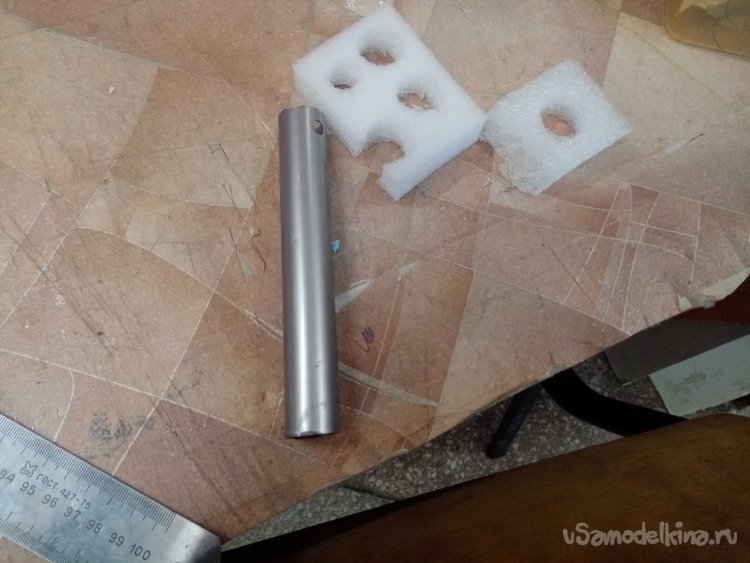 По краю она заточена и нанесены небольшие заусенцы. Процесс формирования отверстия происходит поворачиванием трубочки. Прорезаю вращением. Подбираю кусочек упаковочного поролона и прорезаю несколько отверстий. Получаются поролоновые цилиндрики. Вполне достаточная амортизация и без обратного эффекта.