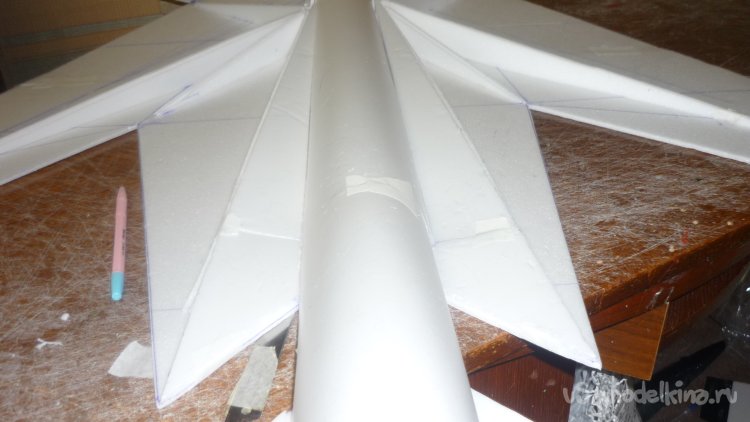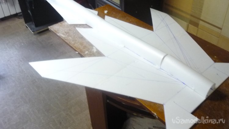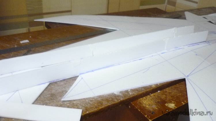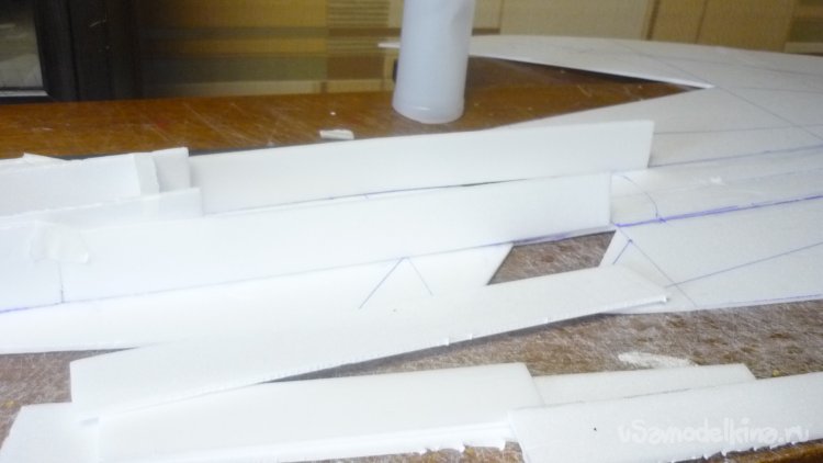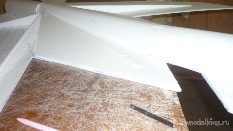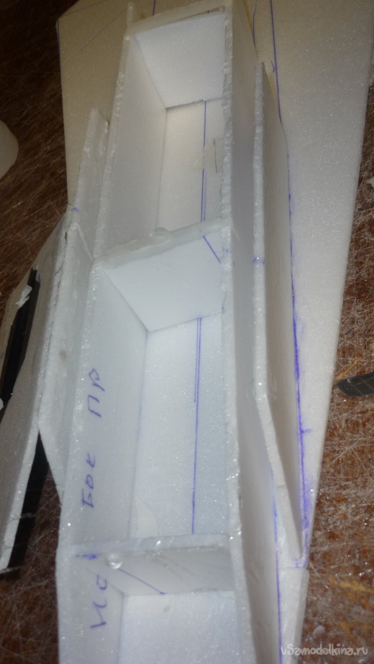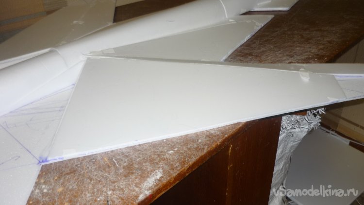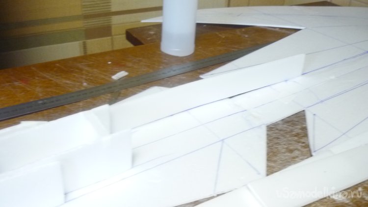 Фюзеляж готов и можно переходить к установки внешней обшивки модели. надо сказать, что вся внешняя обшивка разделена мною на несколько отдельных сегментов С помощью внутренних, вертикальных перегородок - лонжеронов и соединения всех сегментов внешней обшивки под определёнными углами, достигается нужная прочность и жёсткость конструкции. Ну и создаётся определённый профиль крыла, что позволяет увеличить подъёмную силу . Все лонжероны склеиваются в два слоя. Потому, что они расположены в местах соединительных швов отдельных сегментов внешней обшивки. Каждый соединительный шов, изнутри, поддерживается одним лонжероном.