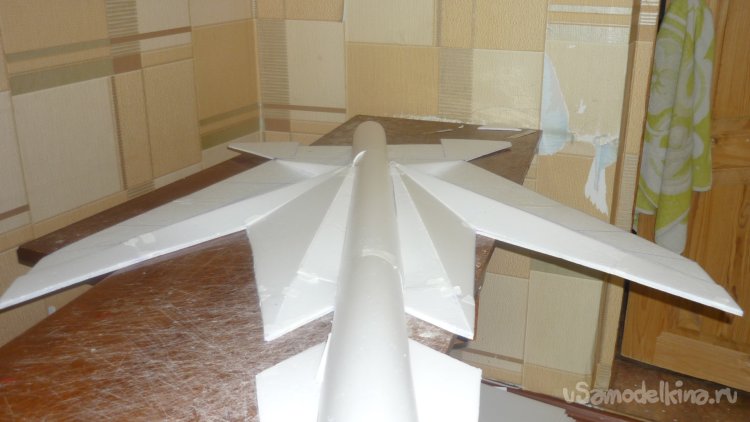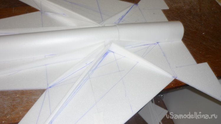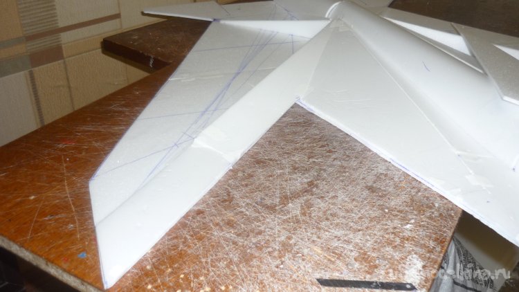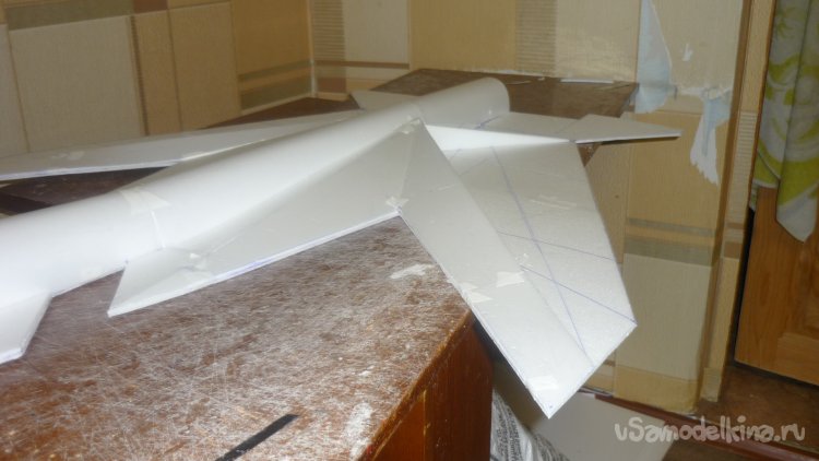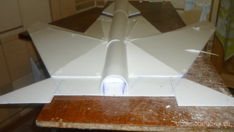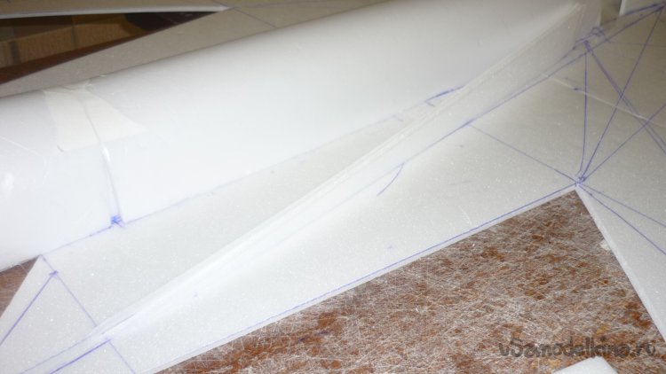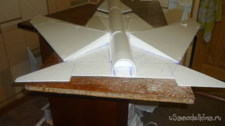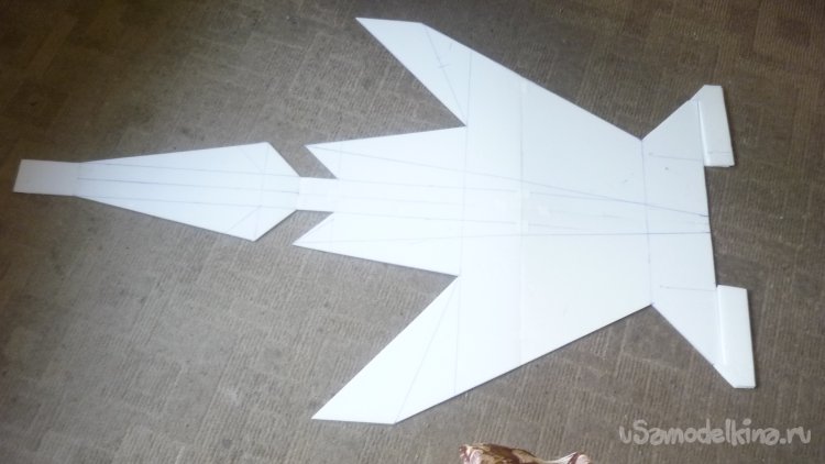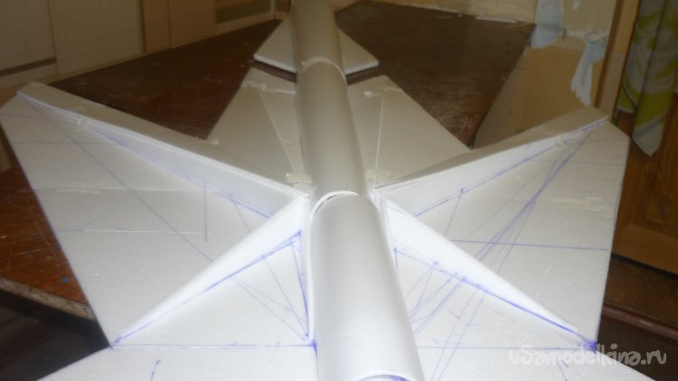 Фюзеляж готов и можно переходить к установки внешней обшивки модели. надо сказать, что вся внешняя обшивка разделена мною на несколько отдельных сегментов С помощью внутренних, вертикальных перегородок - лонжеронов и соединения всех сегментов внешней обшивки под определёнными углами, достигается нужная прочность и жёсткость конструкции. Ну и создаётся определённый профиль крыла, что позволяет увеличить подъёмную силу . Все лонжероны склеиваются в два слоя. Потому, что они расположены в местах соединительных швов отдельных сегментов внешней обшивки. Каждый соединительный шов, изнутри, поддерживается одним лонжероном.