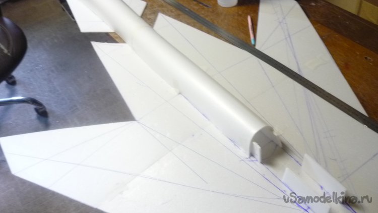 Смонтировал носовую часть к основной несущей поверхности модели и начиню вклеивать внутренние, технологические, вертикальные перегородки на которое буду монтировать внешнюю обшивку фюзеляжа.