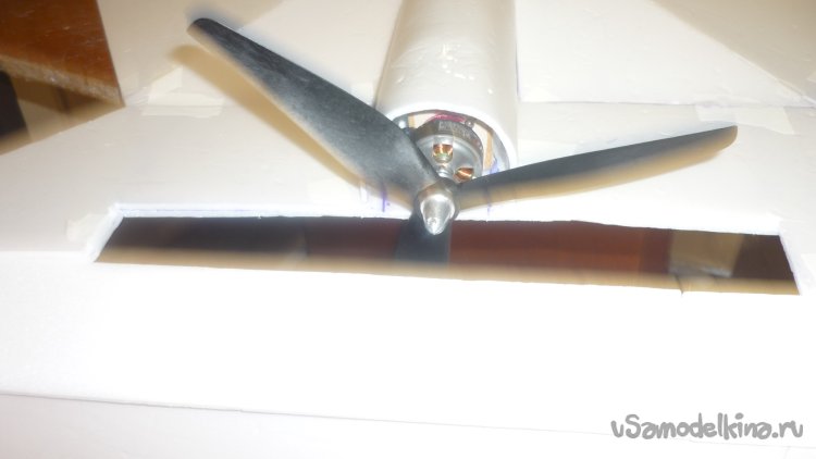 Подготовил к установке мотор. Предварительно вырезав кусочек утеплителя, приклеив на него кусочек 3 мм фанеры, а на него закрепил мотор.