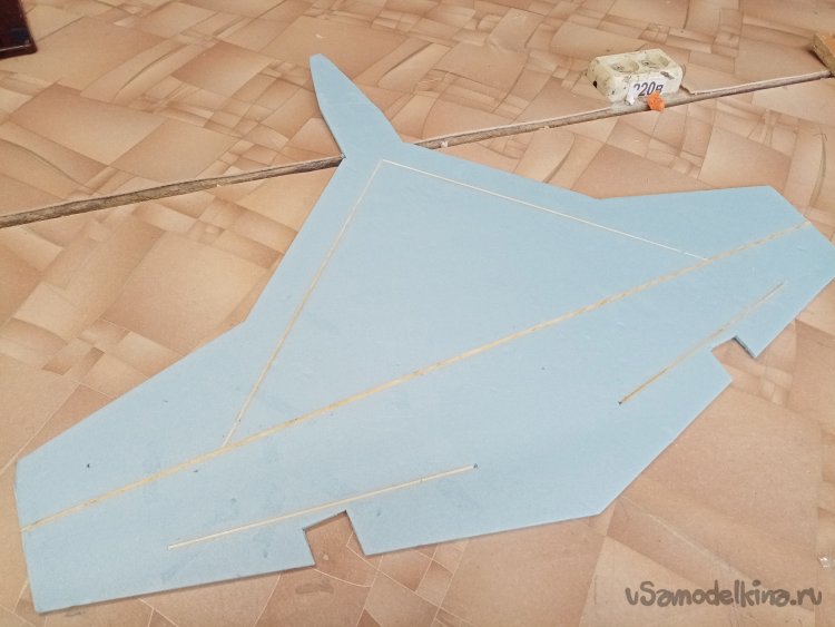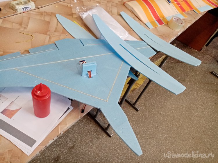 После высыхания клея, примерно через сутки можно продолжать работу. Отрезаю элевоны. Небольшое пояснение. В варианте летающего крыла рулевые поверхности называются ЭЛЕВОНЫ. Они выполняют функции элеронов и руля высоты. Такая функция устанавливается в передатчика путем микширования программ управления.