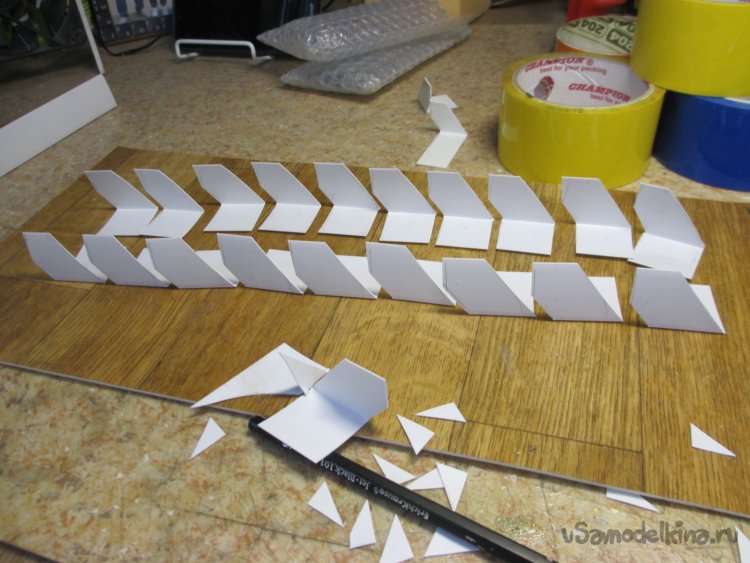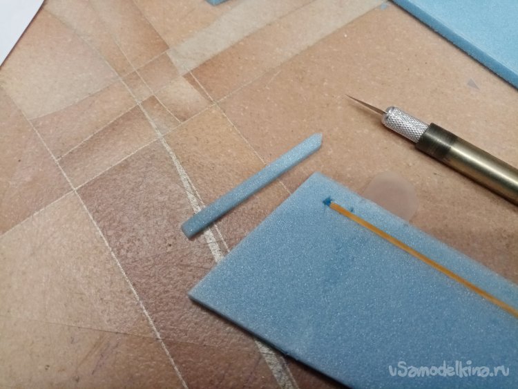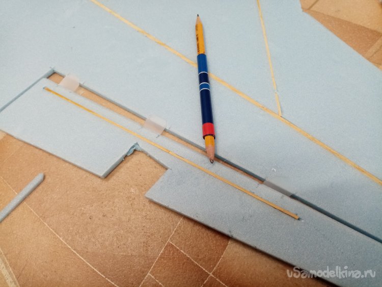 Затем прорезаю пазы в деталях из подложки под ламинат. Вклеиваю рейки на титане. Фиксирую при помощи малярного скотча.