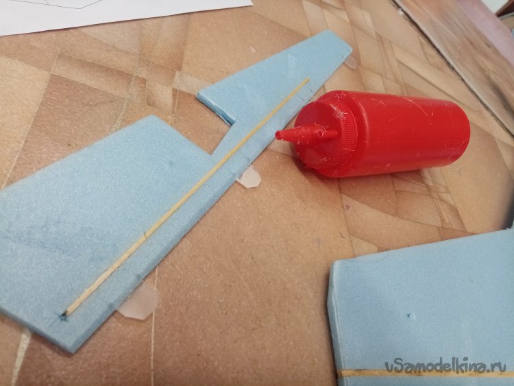 Для удобства сборки стенки фюзеляжа немного изгибаю о круглую кромку стола. Подгоняю и приклеиваю на крыло.
