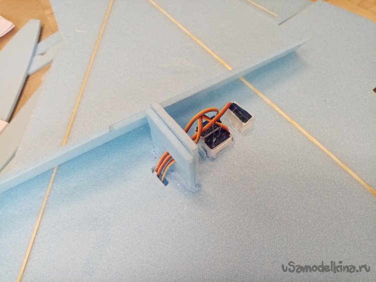 Почти все готово. Нужно устанавливать сервоприводы. На полочке лежит хорошая коробочка с необходимыми деталями. Сервоприводы весом в 9 грамм, с усилием в 1,5 кг. Вполне достаточно для такого маленького самолетика.