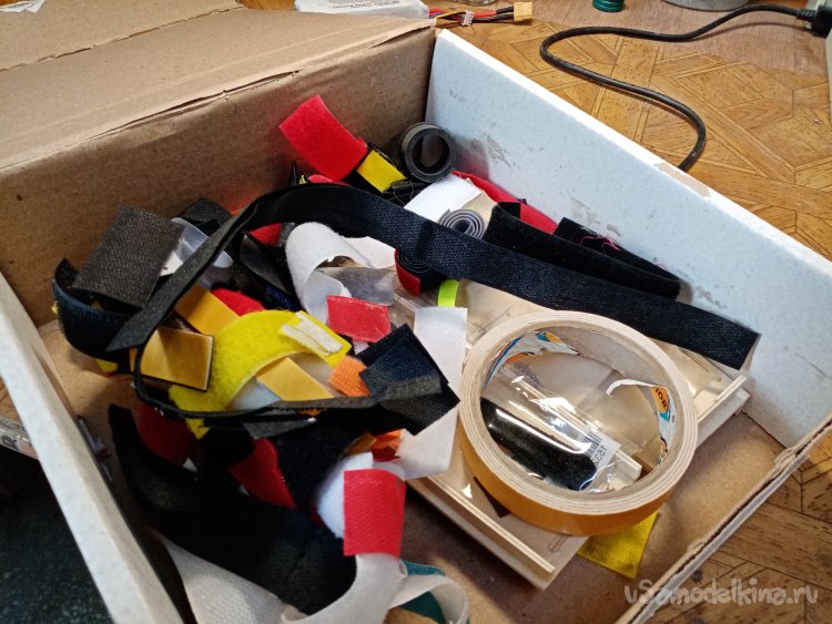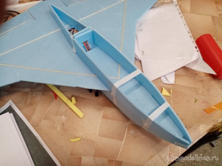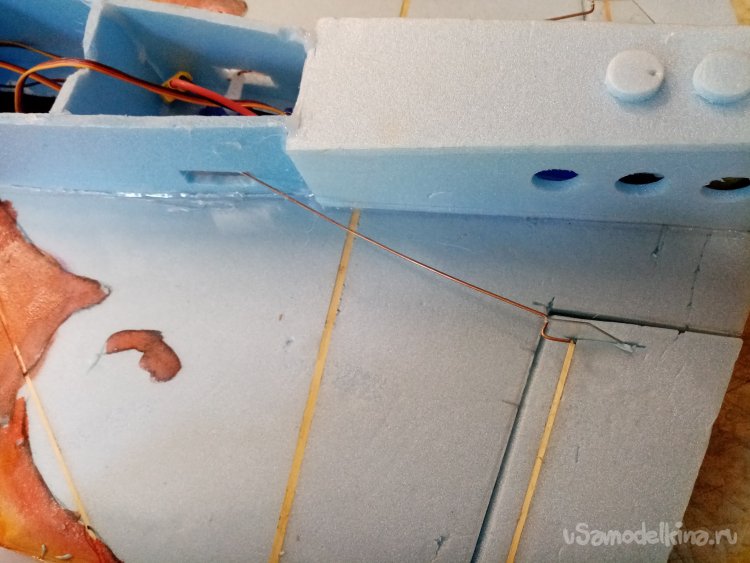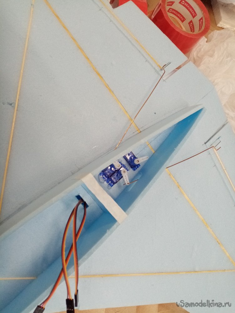 Закрепляю аппаратуру внутри корпуса, протягиваю удлинители вперед. Сервоприводы оборачиваю малярным скотчем для защиты и приклеиваю на термопистолет.