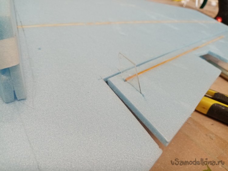 Чтобы прорезать пазы для петель в заготовке пенопласта есть два варианте. Первый - прорезаю треугольным ножом для творчества. Стараюсь ровно попасть в середину толщины.