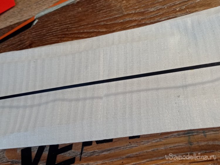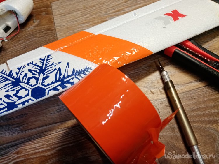 Сейчас с трещиной на крыле нужно решить проблему. Снимаю канцелярским ножом с выдвижным лезвием красивую полоску оранжевого скотча.