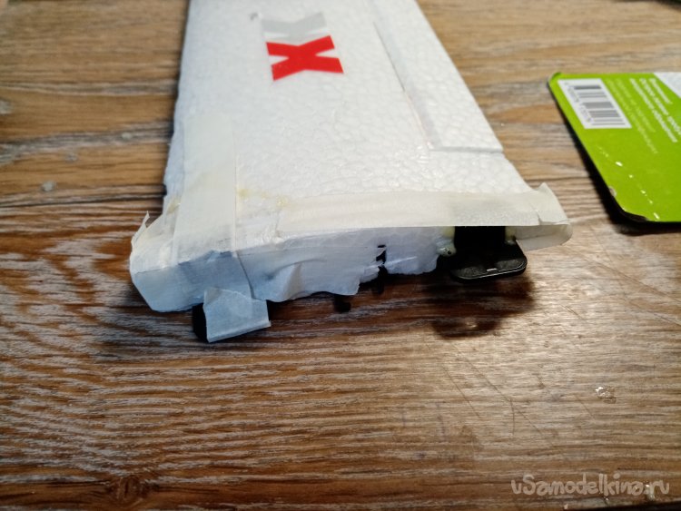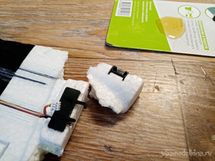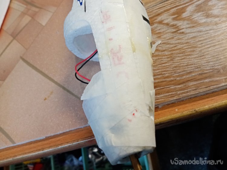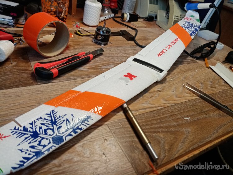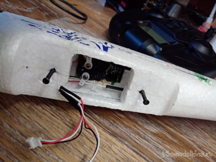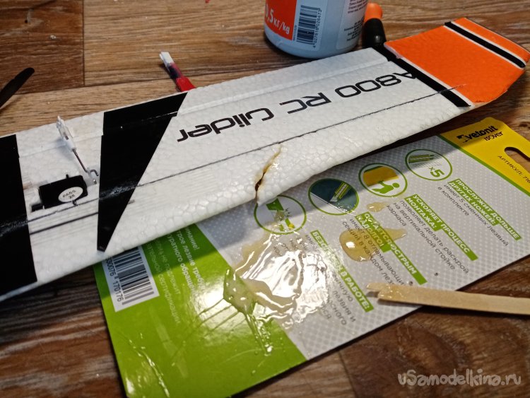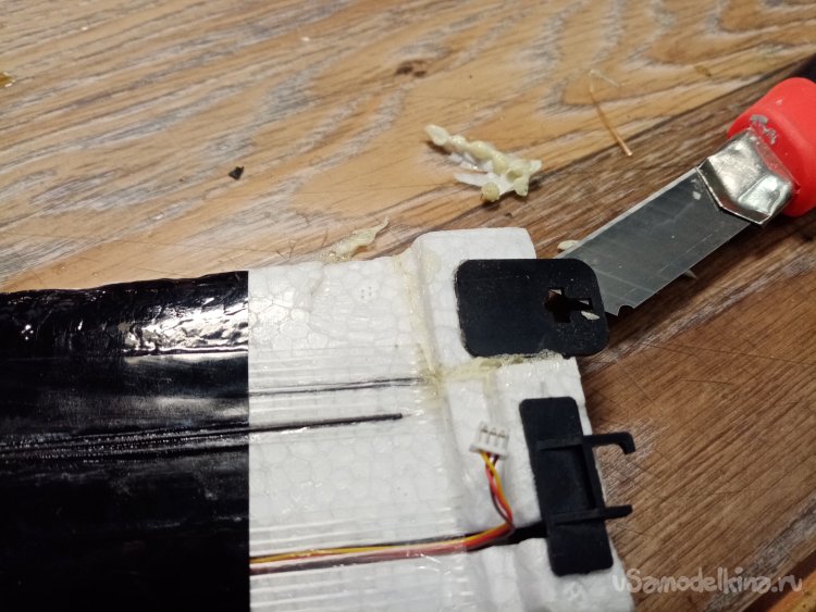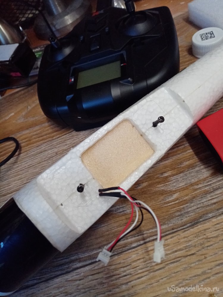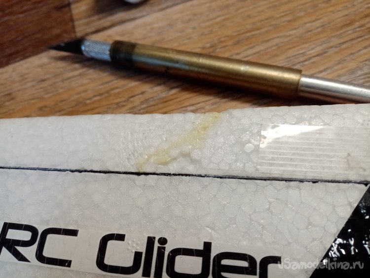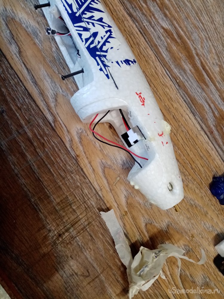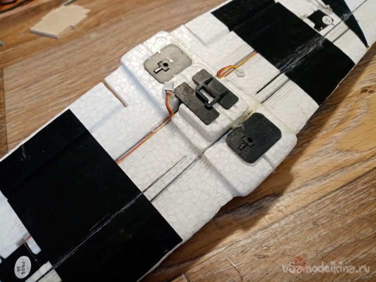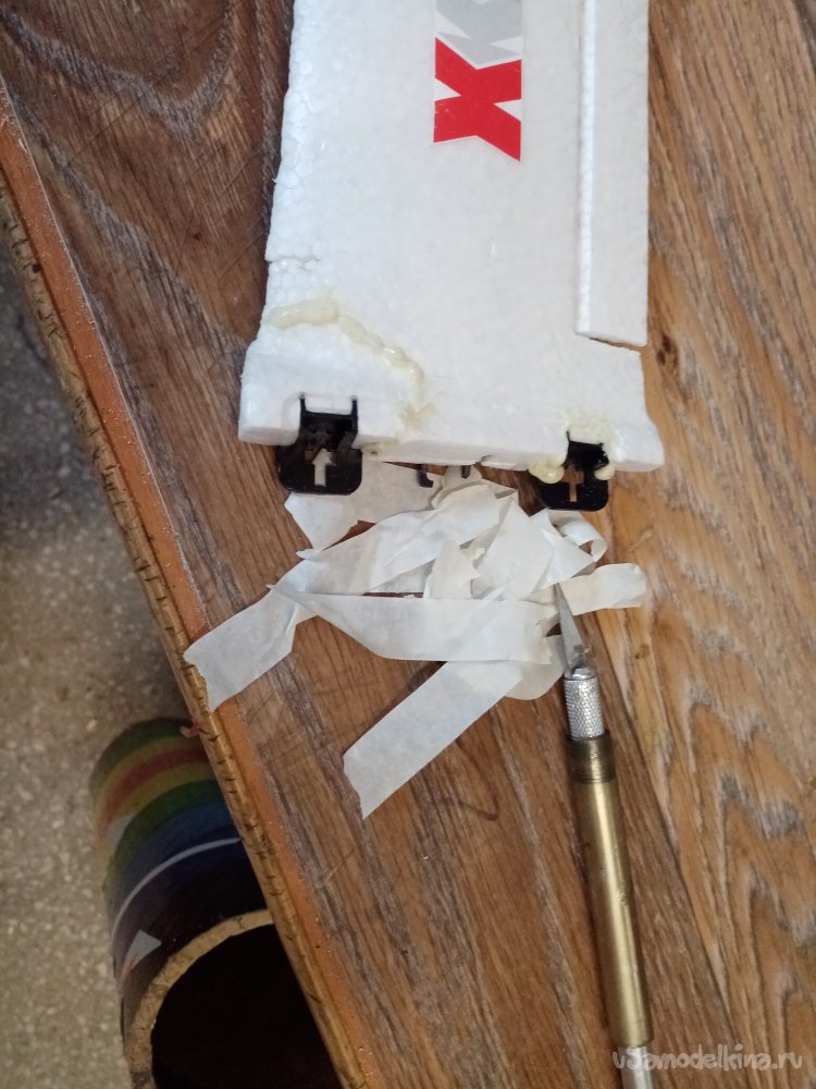 И так начинаю собирать самолетик для полетов. Первым делом немного укрепил клеем выход проводов управления сервоприводами из крыла