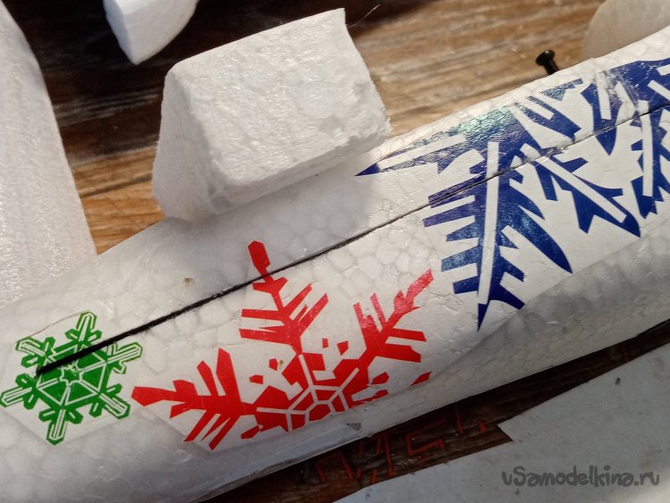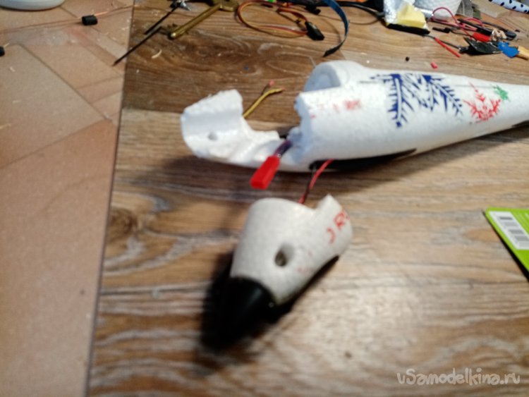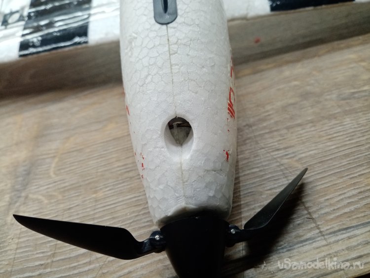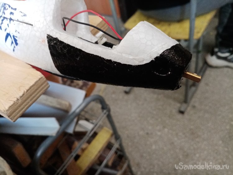 Парочку врезаю в хвостовую балку. Заклеиваю на циакрин. Этот пенопласт не растворяется клеем. И один прутик в нижнюю часть.