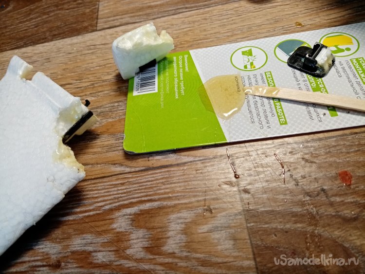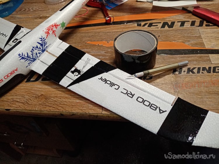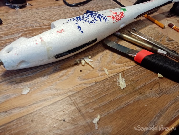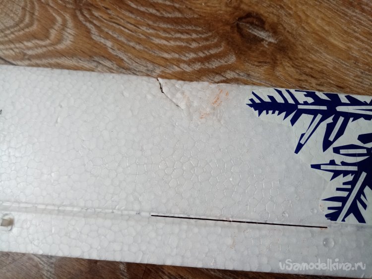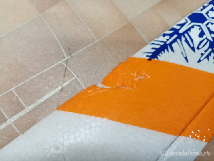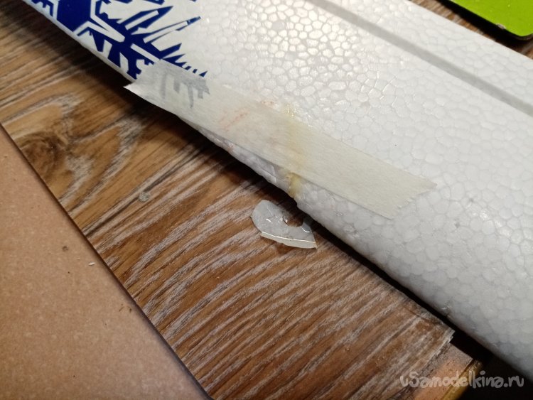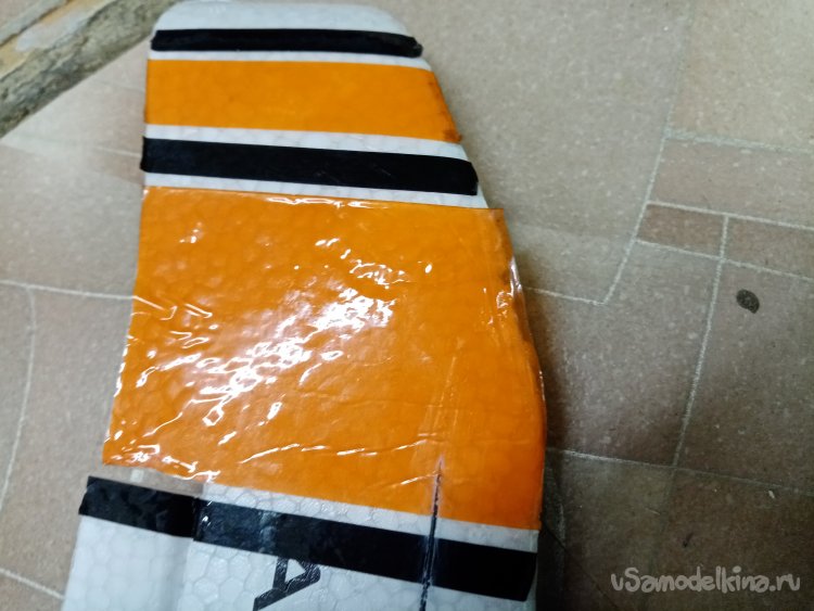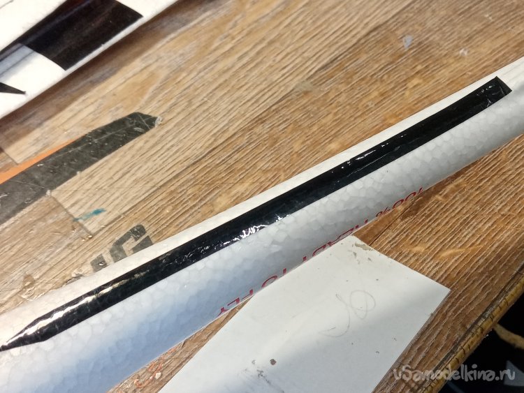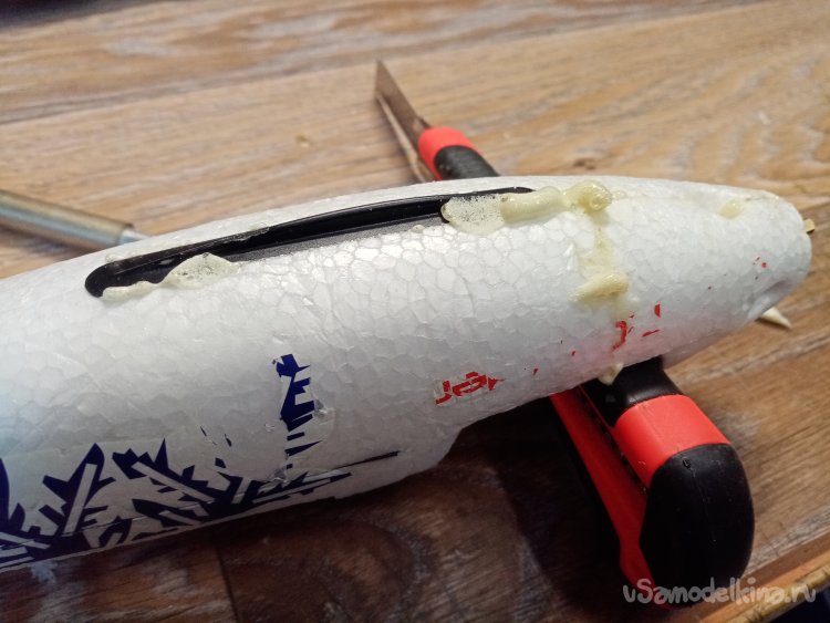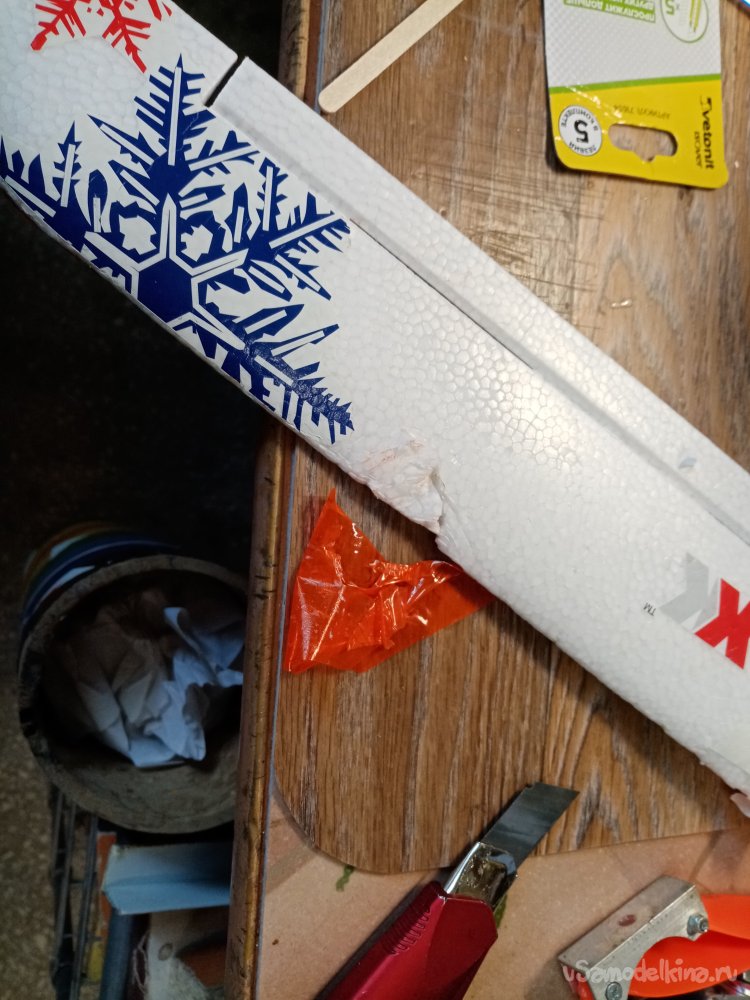 Но упустил маленькую проблему. Лыжа на пузике тоже выпала из гнезда. Пришлось по новой мазать клеем, фиксировать скотчем. Ремонт затянулся еще на сутки. Затем подрезаю застывшую пену, немного шлифую шкуркой и готова лыжа усиления.