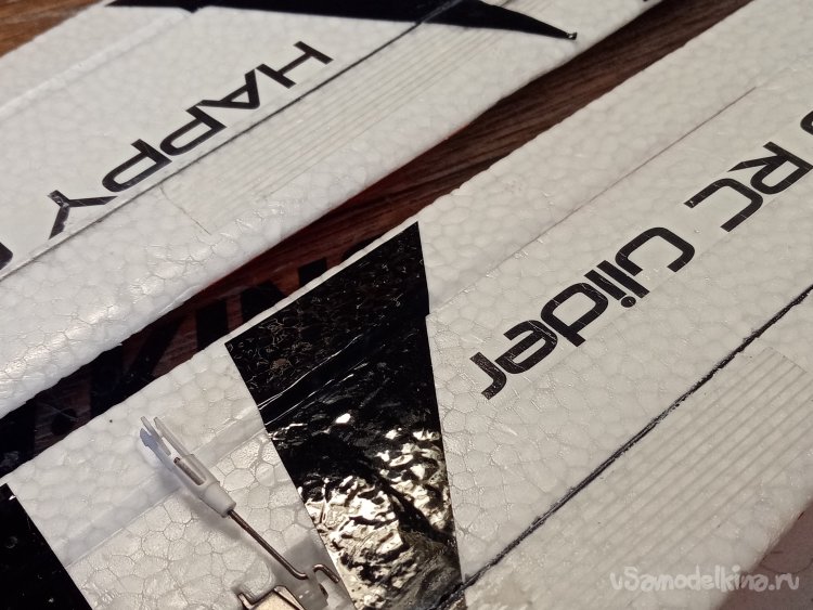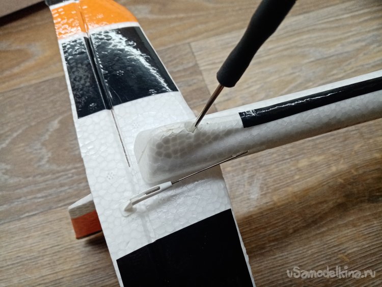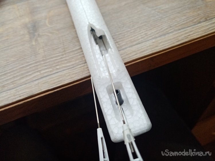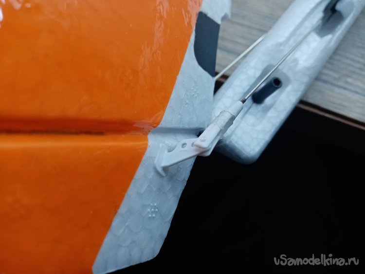При установке руля направления и руля высоты нужно закрепить тяги от сервоприводов, установленных в фюзеляже под крылом.