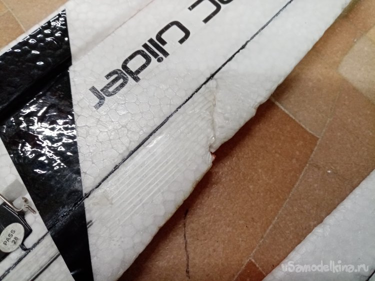 Крепления стыковки крыльев повреждены, не критично. Есть залом не передней кромке крыла и немого по краю.