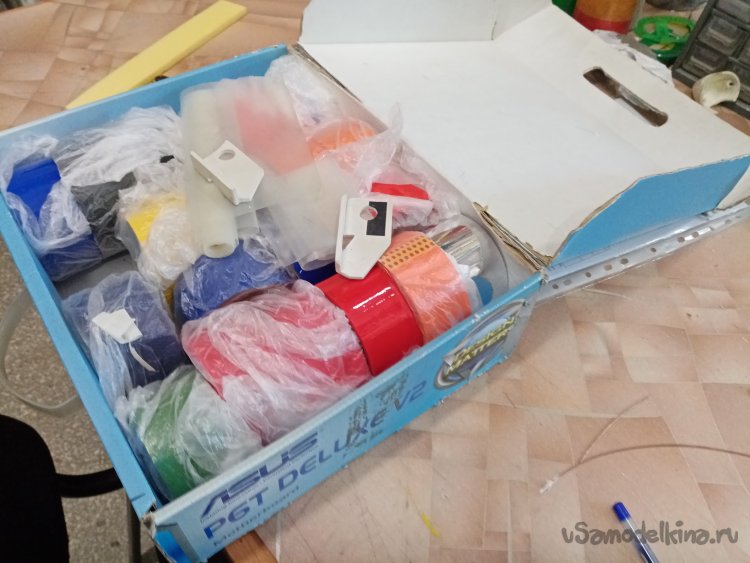 Мой ящик с цветным скотчем всегда готов. Выбираю самые яркие цвета. Но не буду заклеивать полностью. Не нагонять веса, самолет маленький. Каждый грамм на счету.
