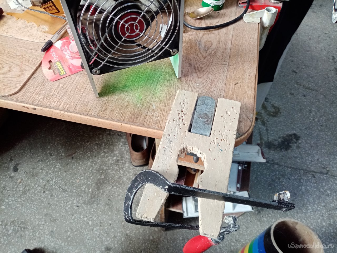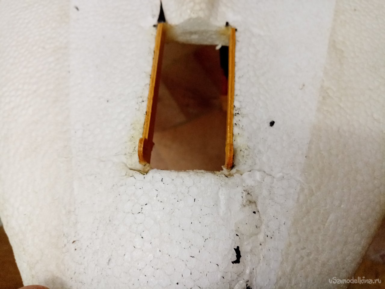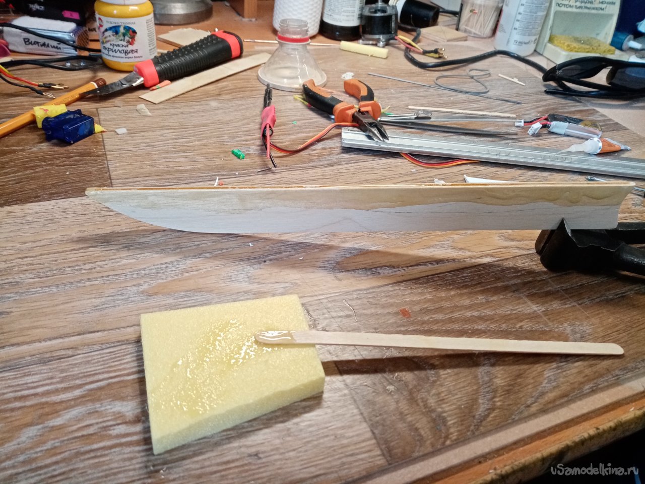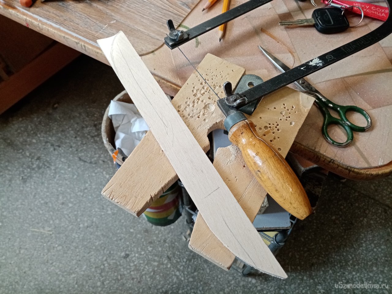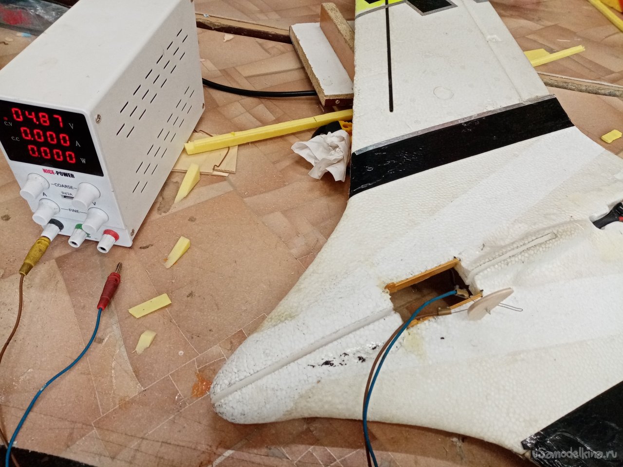 Возникла идея укрепить его полоской 3 мм шлифованной фанеры. Не только по причине прочности, но и для удобства запуска. На брошке есть совершенно небольшие выступы для захвата. Но удержать самолетик за них трудно. Подрезал выступивший клей. Прошелся немного по носику шкуркой. Нужно прорезать в корпусе паз шириной в 3мм. Буду работать самодельным терморезаком. Извлекаю с полки блок питания, нужно изготовит по новому нихромовый резак на пазик в 3 мм.